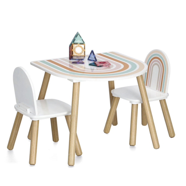 Σετ τραπεζάκι και καρέκλες για το βρεφικό και παιδικό δωμάτιο. Είναι κατασκευασμένα από ξύλο πεύκου και MDF σε λευκό χρώμα με πολύχρωμες λεπτομέρειες και σχέδιο ουράνιο τόξο. Διαθέτουν στρογγυλεμένες άκρες για να προστατεύουν τα παιδιά από τραυματισμούς. Είναι κατάλληλα για παιδιά ηλικίας 1.5 έως 4 ετών. Μέγιστο βάρος αντοχής ανά καρέκλα 30kg και 20kg για το τραπέζι. Με πιστοποίηση FSC 100% SCS-COC-000256. *Το προϊόν έρχεται αμοντάριστο.*