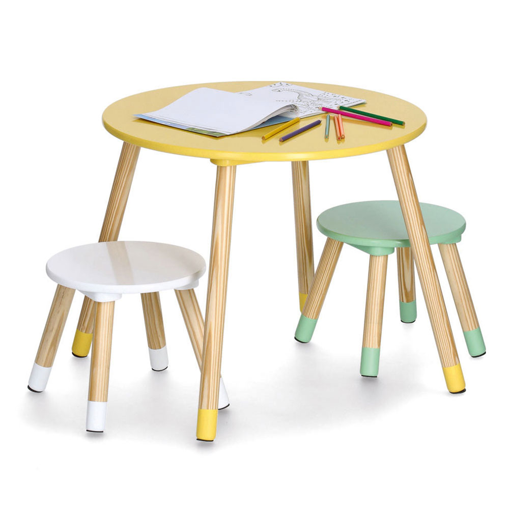 Σετ τραπεζάκι και σκαμπό για το βρεφικό και παιδικό δωμάτιο. Είναι κατασκευασμένα από ξύλο πεύκου και MDF σε μπεζ χρώμα με βεραμάν, κίτρινες και λευκές λεπτομέρειες. Ο στρογγυλός σχεδιασμός δεν εξυπηρετεί μόνο οπτικούς σκοπούς αλλά μειώνει επίσης τον κίνδυνο τραυματισμού σε επικίνδυνες γωνίες. Με πιστοποίηση FSC 100% SCS-COC-000256. *Το προϊόν έρχεται αμοντάριστο.*