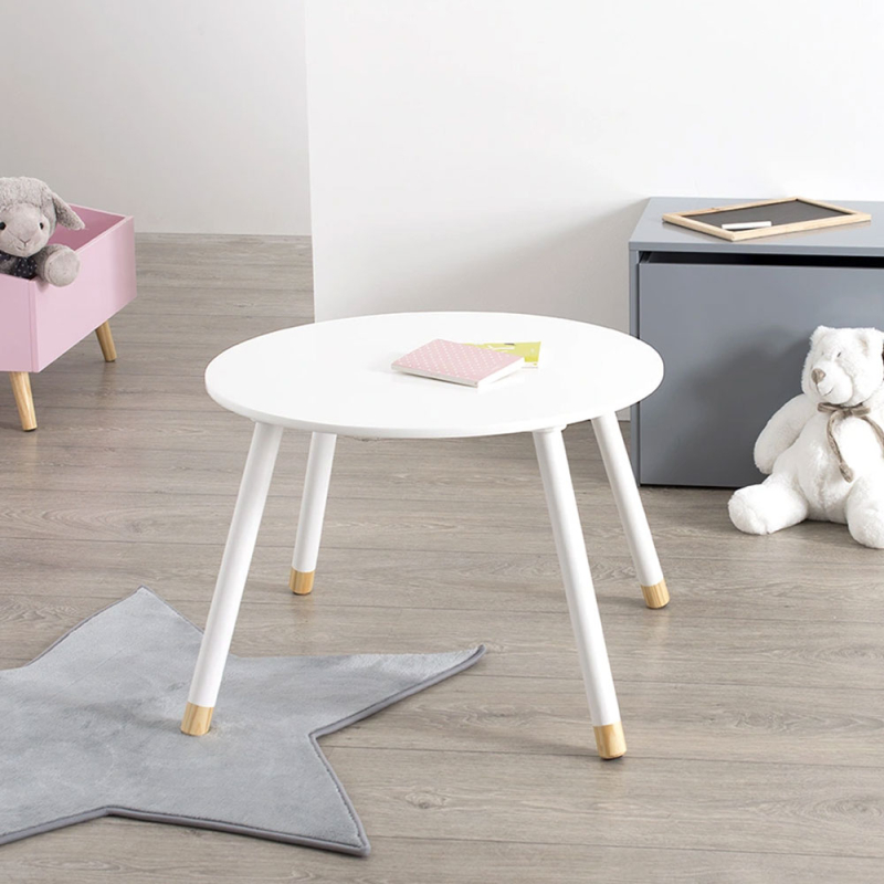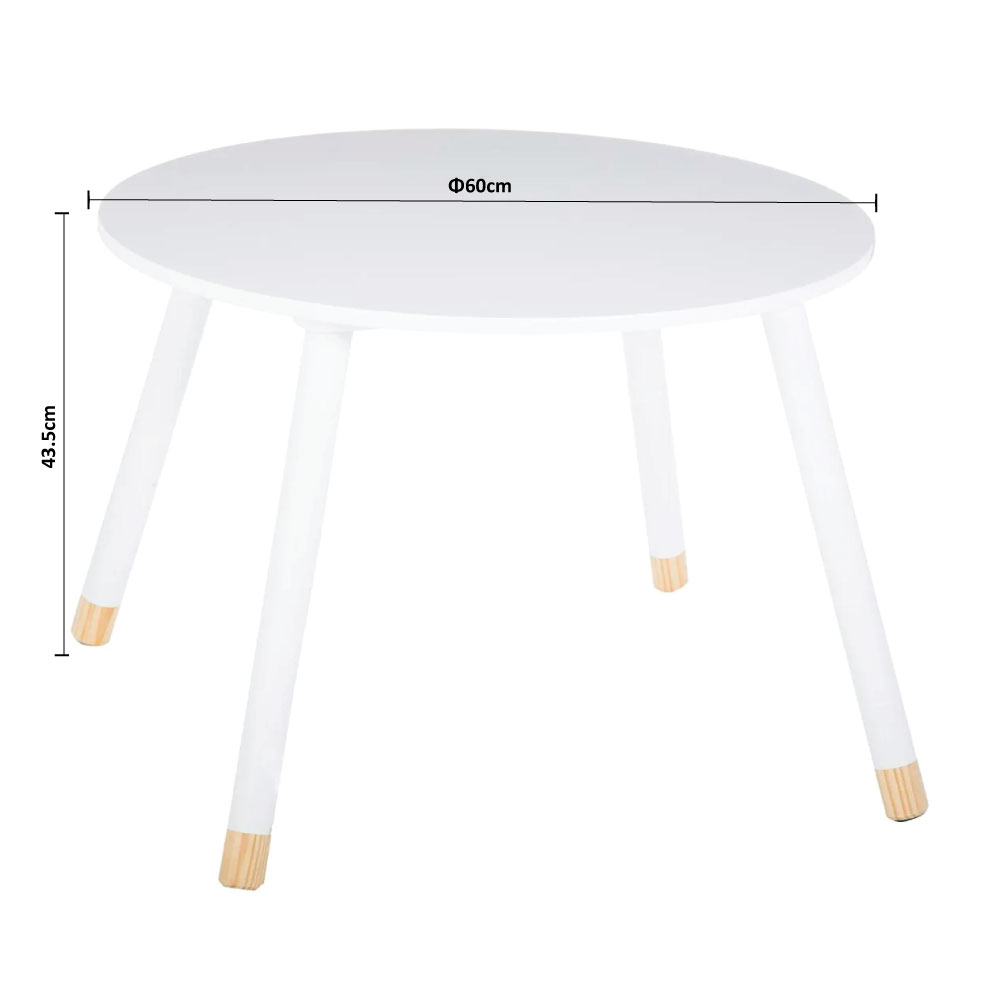 Στρογγυλό τραπεζάκι ιδανικό για να παίζει ή να ζωγραφίζει το παιδί σας. Είναι κατασκευασμένο από ξύλο MDF_E1 με λευκό χρώμα και λεπτομέρειες σε φυσική απόχρωση. Μπορεί να τοποθετηθεί σε εσωτερικούς χώρους, όπως το παιδικό δωμάτιο, το σαλόνι και όπου αλλού είναι χρήσιμο. Σύμφωνο με τα πρότυπα: NF D 60-300-1 και NF D 60-300-3. Το προϊόν έρχεται αμοντάριστο και συναρμολογείται βάσει οδηγιών.