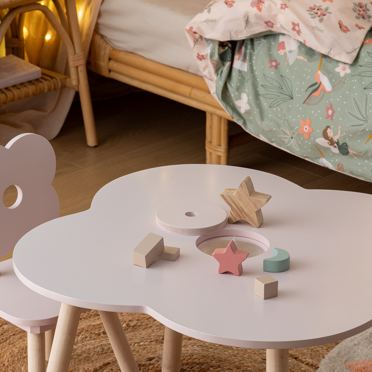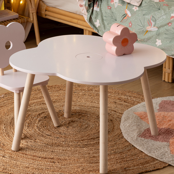 Παιδικό τραπεζάκι ιδανικό για να παίζει ή να ζωγραφίζει το παιδί σας. Είναι κατασκευασμένο από ξύλο ελάτου και MDF_E1 σε ροζ χρώμα με σχέδιο λουλουδιού και διαθέτει μπεζ πόδια. Στο κέντρο του τραπεζιού υπάρχει ένα καπάκι που από κάτω υπάρχει αποθηκευτικός χώρος για να τοποθετεί το παιδί μικροπράγματα όπως τα μολύβια, τους μαρκαδόρους ή ό,τι άλλο θέλει. Μπορεί να τοποθετηθεί σε εσωτερικούς χώρους, όπως το παιδικό δωμάτιο, το σαλόνι και όπου αλλού είναι χρήσιμο. Μέγιστο βάρος αντοχής: 5kg. *Το προϊόν έρχεται αμοντάριστο και συναρμολογείται βάσει οδηγιών.*