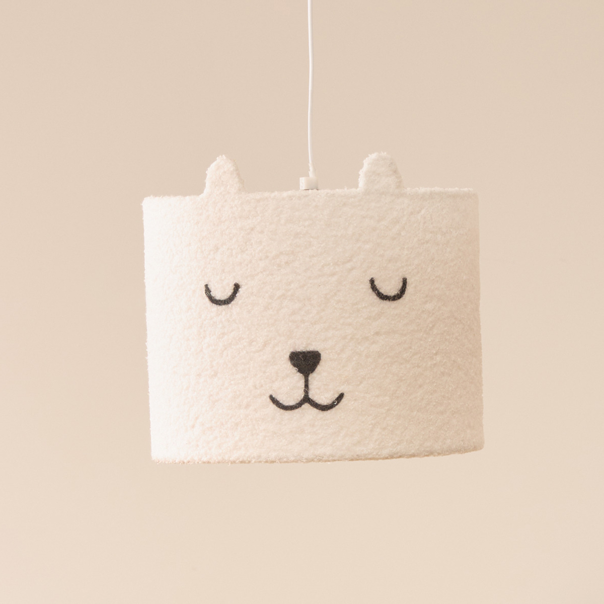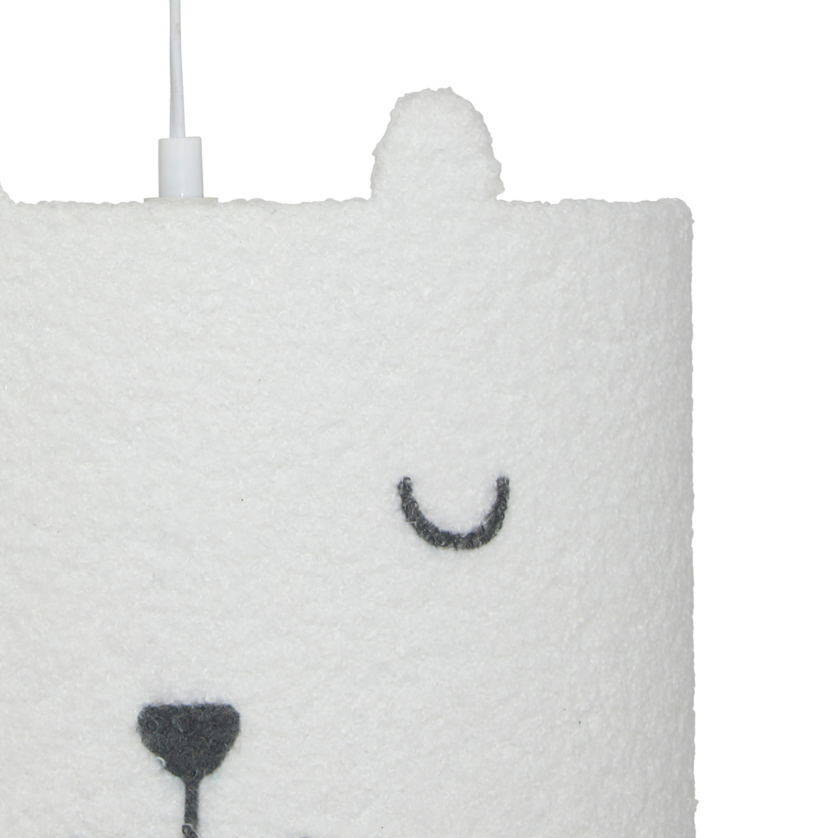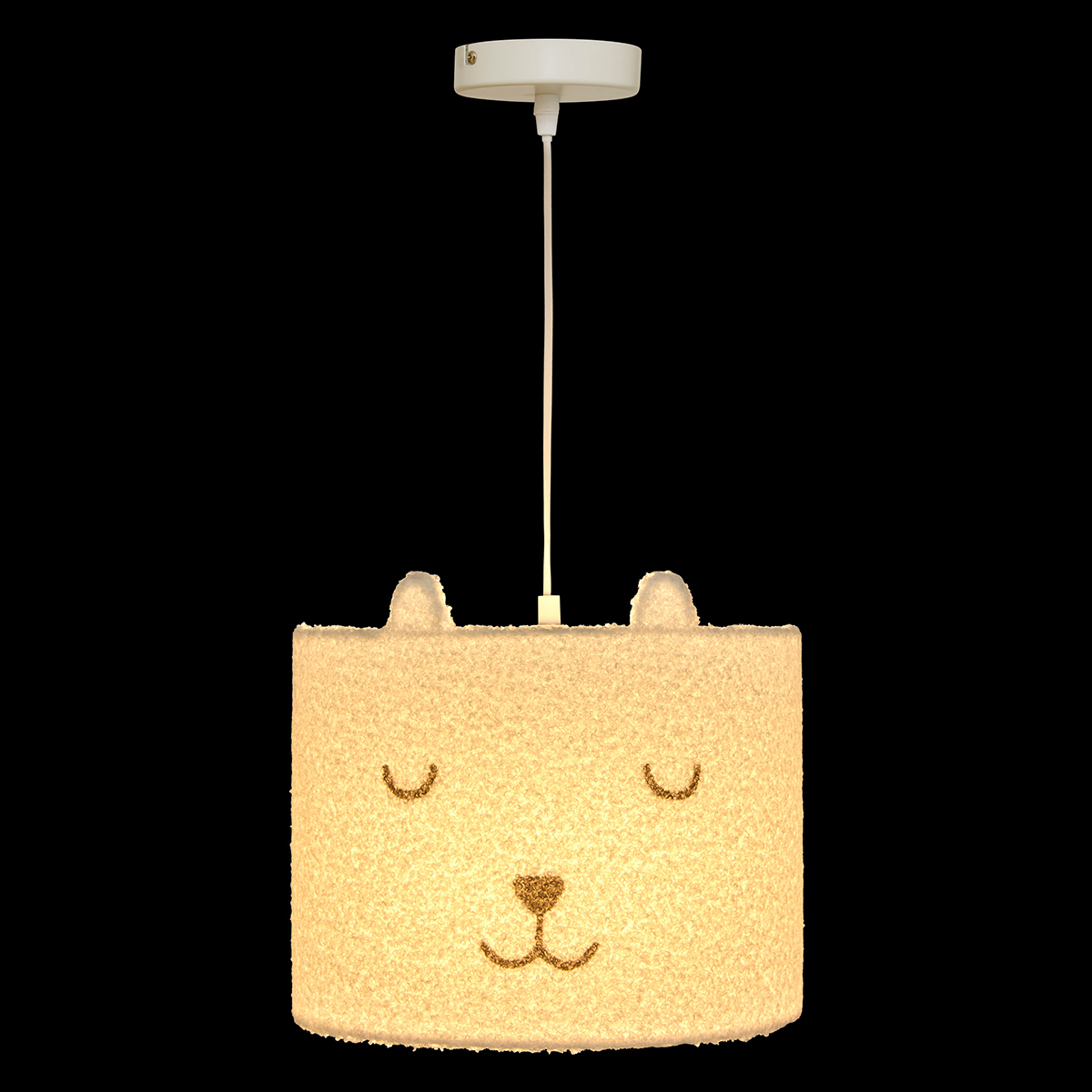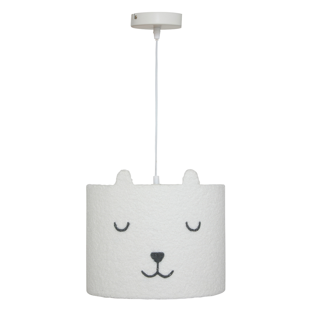 Φωτιστικό οροφής για το βρεφικό και παιδικό δωμάτιο. Το καπέλο είναι κατασκευασμένο από PVC υλικό με επένδυση από λευκό μπουκλέ ύφασμα και σχέδιο ζωάκι. Ο σκελετός είναι μεταλλικός. Μπορείτε να αυξομειώσετε το συνολικό ύψος του φωτιστικού μέσω του καλωδίου που διαθέτει μήκους 80εκ. Τύπος ντουί: 1xE27 και θέση για 1 λαμπτήρα έως 25W (δεν συμπεριλαμβάνεται). Συνδυάστε το με τα υπόλοιπα είδη του ίδιου σετ για ένα ολοκληρωμένο αποτέλεσμα.