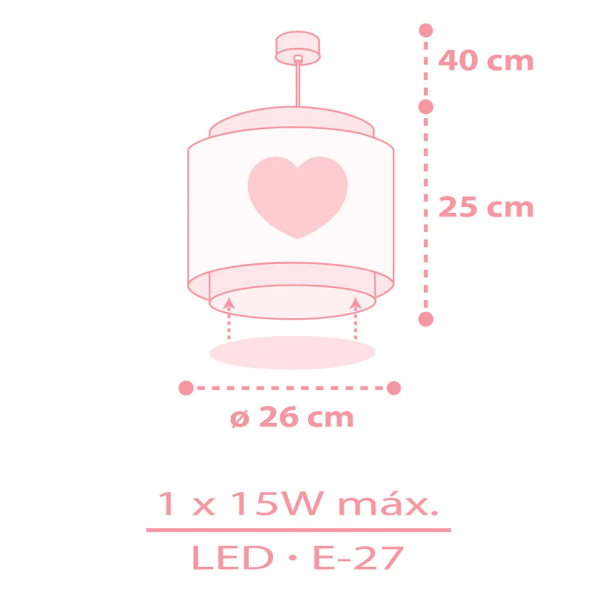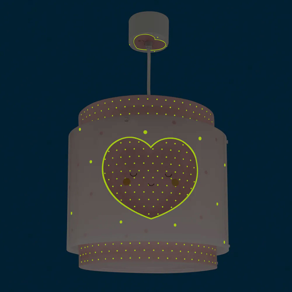 Παιδικό φωτιστικό οροφής της εταιρείας Ango σε ροζ χρώμα με σχέδιο καρδούλα. Είναι σχεδιασμένο για γενικό φωτισμό που παρέχει ομοιόμορφο και άπλετο φωτισμό. Έχει φωσφορίζοντα μέρη στο σκοτάδι. Απόλυτα ασφαλές ώστε τα παιδιά να μπορούν να μελετήσουν, να παίξουν και να κοιμηθούν. Συνθετικό υλικό αντοχής (πολυπροπυλένιο, συνθετικά / πλαστικά μέρη). Διπλού τοιχώματος με διάφανο το εξωτερικό του για μέγιστη φωτεινότητα. Κιτ ανάρτησης ρυθμιζόμενο έως 40εκ. ύψος κατά την εγκατάσταση (συμπεριλαμβάνεται). Διακοσμημένη ροζέτα κάλυψης σημείων σύνδεσης & στήριξης. Ανεξίτηλη εκτύπωση σε διάφανο υλικό που προσδίδει δισδιάστατο αποτέλεσμα. Παρέχεται διαχυτής φωτός για ομοιόμορφο φωτισμό. Ιδανικό για γενικό φωτισμό. Τύπος ντουί: 1 Χ E27 με θέση για έναν λαμπτήρα ισχύος έως 15W ή Led(δεν συμπεριλαμβάνεται). Τροφοδοσία ρεύματος 220V–240V. Κατασκευασμένο εξ ολοκλήρου στην Ευρώπη. Ασφάλεια με πιστοποιήσεις στους κανόνες ασφαλείας της ΕΕ. Ενεργειακής κλάσης Α++. Συνδυάστε το με τα υπόλοιπα προϊόντα της ίδιας σειράς για ένα ολοκληρωμένο αποτέλεσμα. Το προϊόν χρειάζεται μερική συναρμολόγηση.