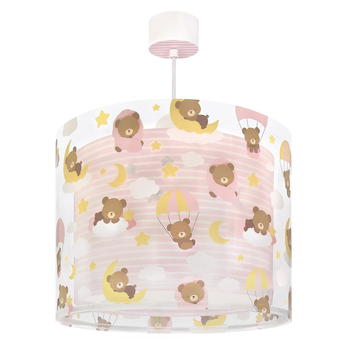 Παιδικό φωτιστικό οροφής της εταιρείας Ango σε λευκό-ροζ χρώμα με αρκουδάκια στο σχέδιο. Είναι κατασκευασμένο από πολυπροπυλένιο. Διαθέτει κιτ ανάρτησης ρυθμιζόμενο στο ύψος. Παρέχεται διαχυτής φωτός για ομοιόμορφο φωτισμό. Διαθέτει διπλό διάφανο εξωτερικό τοίχωμα και μέρη που φωσφορίζουν. Τύπος ντουί E27 και θέση για έναν λαμπτήρα LED ισχύος έως 15W (δεν συμπεριλαμβάνεται). Τροφοδοσία ρεύματος: 220V–240V. Κατασκευασμένο εξ ολοκλήρου στην Ευρώπη. Ασφάλεια με πιστοποιήσεις στους κανόνες ασφαλείας της ΕΕ. Ενεργειακής κλάσης Α++. Το προϊόν χρειάζεται μερική συναρμολόγηση. Συμπληρώνει τα υπόλοιπα φωτιστικά της συλλογής και είναι εξαιρετικά εύκολο στην εγκατάστασή του και παρέχετε με καλώδιο και ροζέτα.