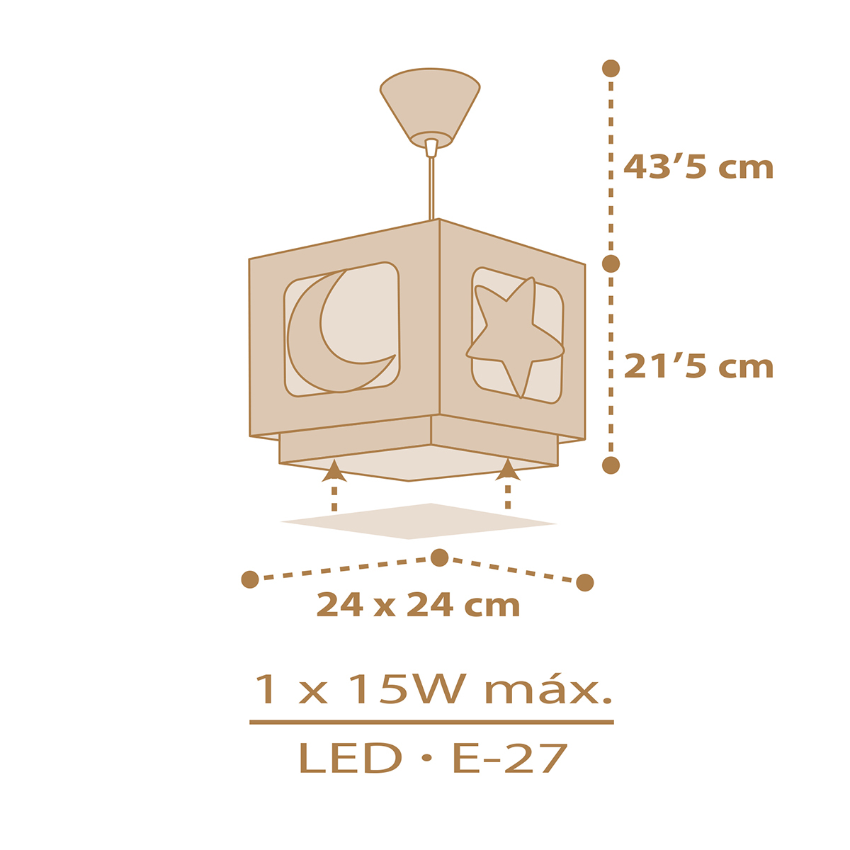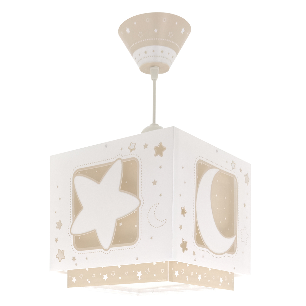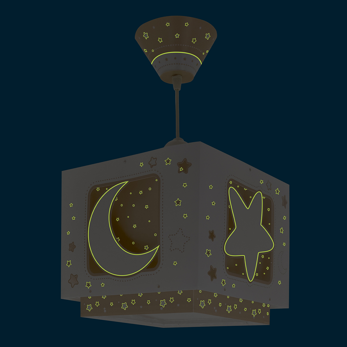 Παιδικό φωτιστικό οροφής της εταιρείας Ango, σε λευκό χρώμα με μπεζ λεπτομέρειες και σχέδιο με αστέρια. Είναι σχεδιασμένο για γενικό φωτισμό διπλού τοιχώματος με φωσφορίζοντα μέρη στο εξωτερικό του τοίχωμα. Συνθετικό υλικό αντοχής πολυπροπυλενίου. Κιτ ανάρτησης ρυθμιζόμενο στο ύψος με διακοσμημένη ροζέτα. Παρέχεται διαχυτής φωτός για ομοιόμορφο φωτισμό. Τύπος ντουί E27 και θέση για έναν λαμπτήρα οικονομίας ισχύος έως 15W ή Led(δεν συμπεριλαμβάνεται). Τροφοδοσία ρεύματος: 220V–240V. Κατασκευασμένο εξ ολοκλήρου στην Ευρώπη. Ασφάλεια με πιστοποιήσεις στους κανόνες ασφαλείας της ΕΕ. Ενεργειακής κλάσης Α++. Το Moon φωτιστικό οροφής συμπληρώνει τα υπόλοιπα παιδικά φωτιστικά της συλλογής. Το προϊόν χρειάζεται μερική συναρμολόγηση.