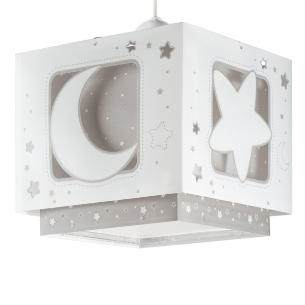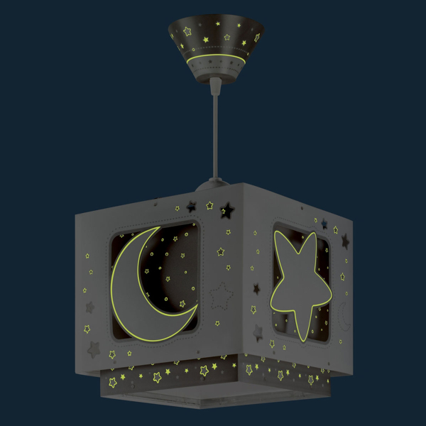 Παιδικό φωτιστικό κρεμαστό οροφής κατάλληλο για γενικό φωτισμό διπλού τοιχώματος με φωσφορίζοντα μέρη στο εξωτερικό του τοίχωμα. Συνθετικό υλικό αντοχής πολυπροπυλενίου. Κιτ ανάρτησης ρυθμιζόμενο στο ύψος με διακοσμημένη ροζέτα. Παρέχεται διαχυτής φωτός για ομοιόμορφο φωτισμό. Τύπος ντουί E27 και θέση για έναν λαμπτήρα οικονομίας ισχύος έως 23 W ή Led(δεν συμπεριλαμβάνεται). Τροφοδοσία ρεύματος: 220V–240V. Κατασκευασμένο εξ ολοκλήρου στην Ευρώπη. Ασφάλεια με πιστοποιήσεις στους κανόνες ασφαλείας της ΕΕ. Ενεργειακής κλάσης Α++. Το Moon φωτιστικό οροφής συμπληρώνει τα υπόλοιπα παιδικά φωτιστικά της συλλογής. Το προϊόν χρειάζεται μερική συναρμολόγηση.