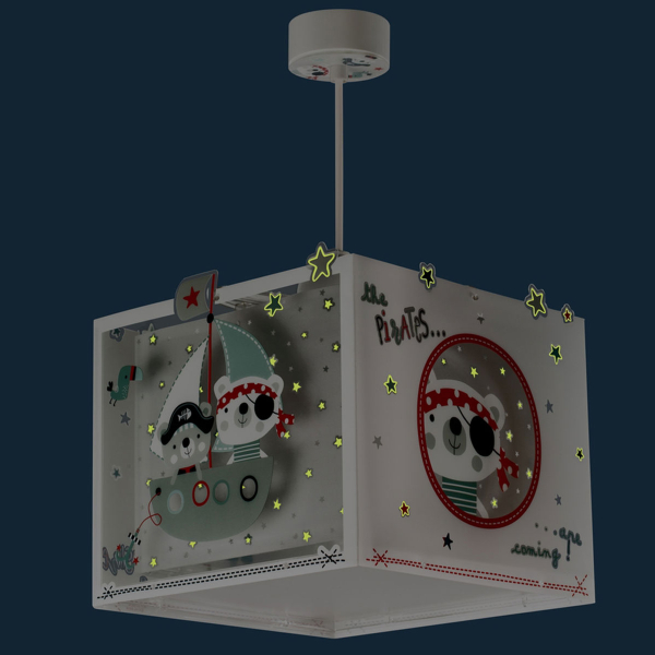 Παιδικό φωτιστικό κρεμαστό οροφής κατάλληλο για γενικό φωτισμό διπλού τοιχώματος με φωσφορίζοντα μέρη στο εξωτερικό του τοίχωμα. Συνθετικό υλικό αντοχής πολυπροπυλενίου. Κιτ ανάρτησης ρυθμιζόμενο στο ύψος με διακοσμημένη ροζέτα. Παρέχεται διαχυτής φωτός για ομοιόμορφο φωτισμό. Τύπος ντουί E27 και θέση για έναν λαμπτήρα οικονομίας ισχύος έως 23 W ή Led(δεν συμπεριλαμβάνεται). Τροφοδοσία ρεύματος: 220V–240V. Κατασκευασμένο εξ ολοκλήρου στην Ευρώπη. Ασφάλεια με πιστοποιήσεις στους κανόνες ασφαλείας της ΕΕ. Ενεργειακής κλάσης Α++. Το The Pirates κρεμαστό φωτιστικό συμπληρώνει τα υπόλοιπα παιδικά φωτιστικά της συλλογής. Το προϊόν χρειάζεται μερική συναρμολόγηση.
