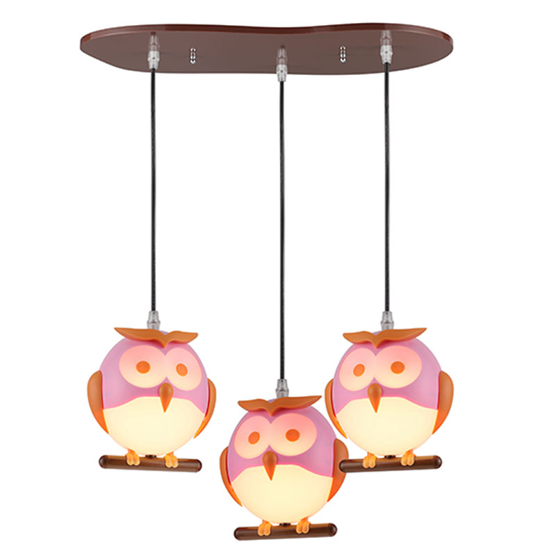 Παιδικό κρεμαστό φωτιστικό της εταιρείας Aca Decor με κουκουβάγιες, ιδανικό για δωμάτιο κοριτσιού. Είναι πλαστικό σε χρώματα ροζ-λευκό-πορτοκαλί-καφέ. Το καλώδιο είναι κατασκευασμένο από μαύρο PVC και η βάση τοποθέτησης είναι καφέ. Τύπος ντουί: 3xE14 και θέσεις για τρεις λαμπτήρες Οικονομίας ή LED έως 13W έκαστος (δεν συμπεριλαμβάνονται).