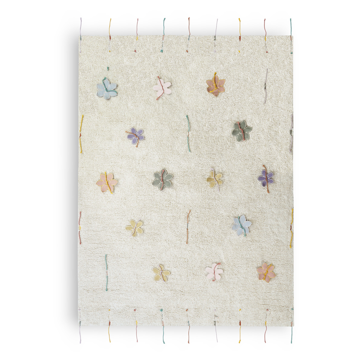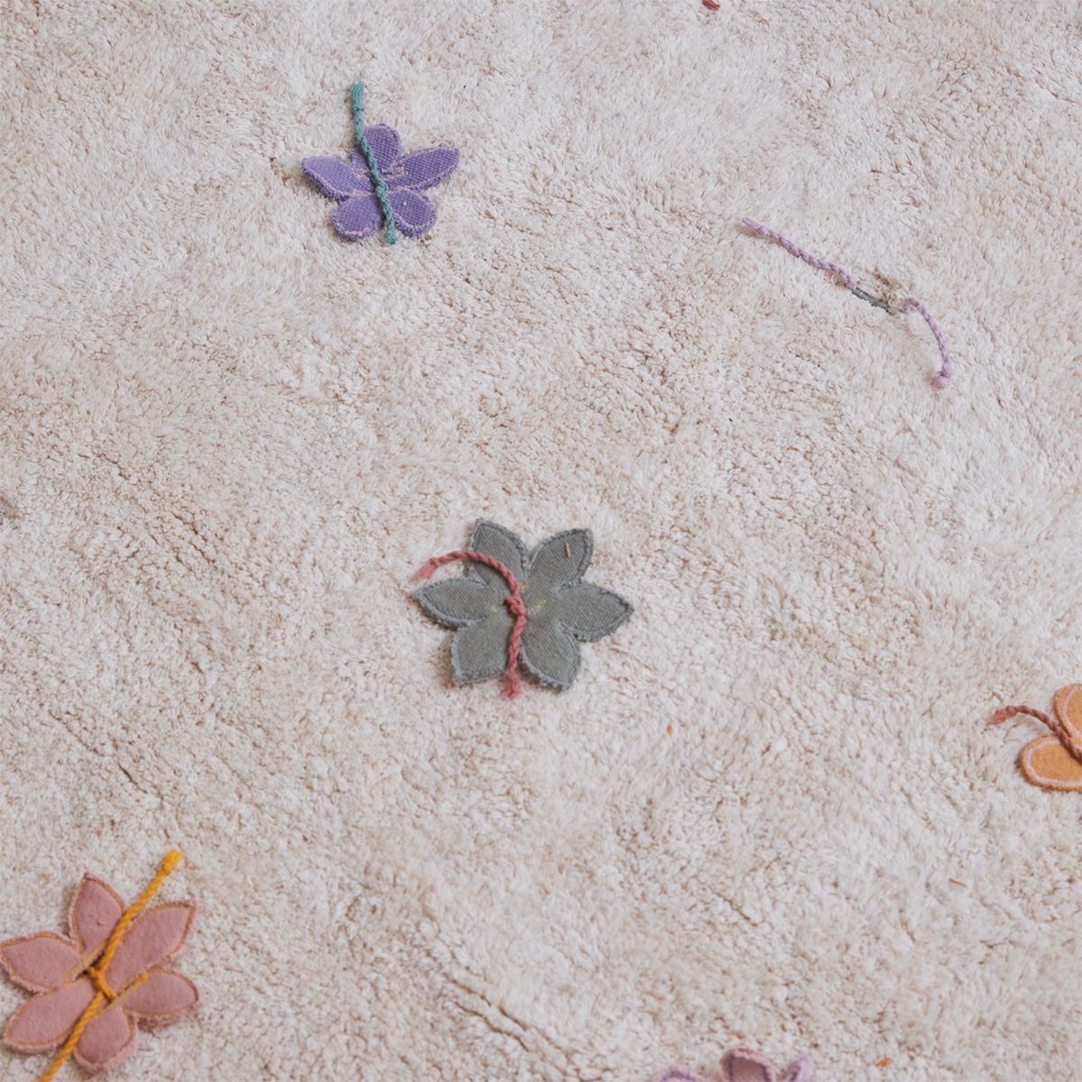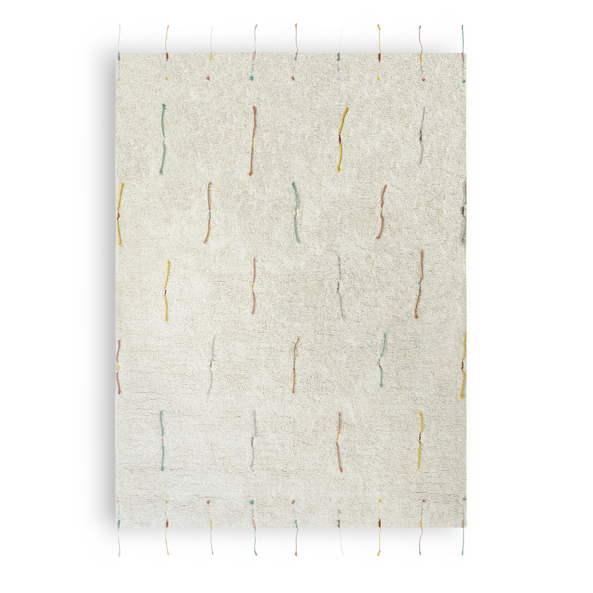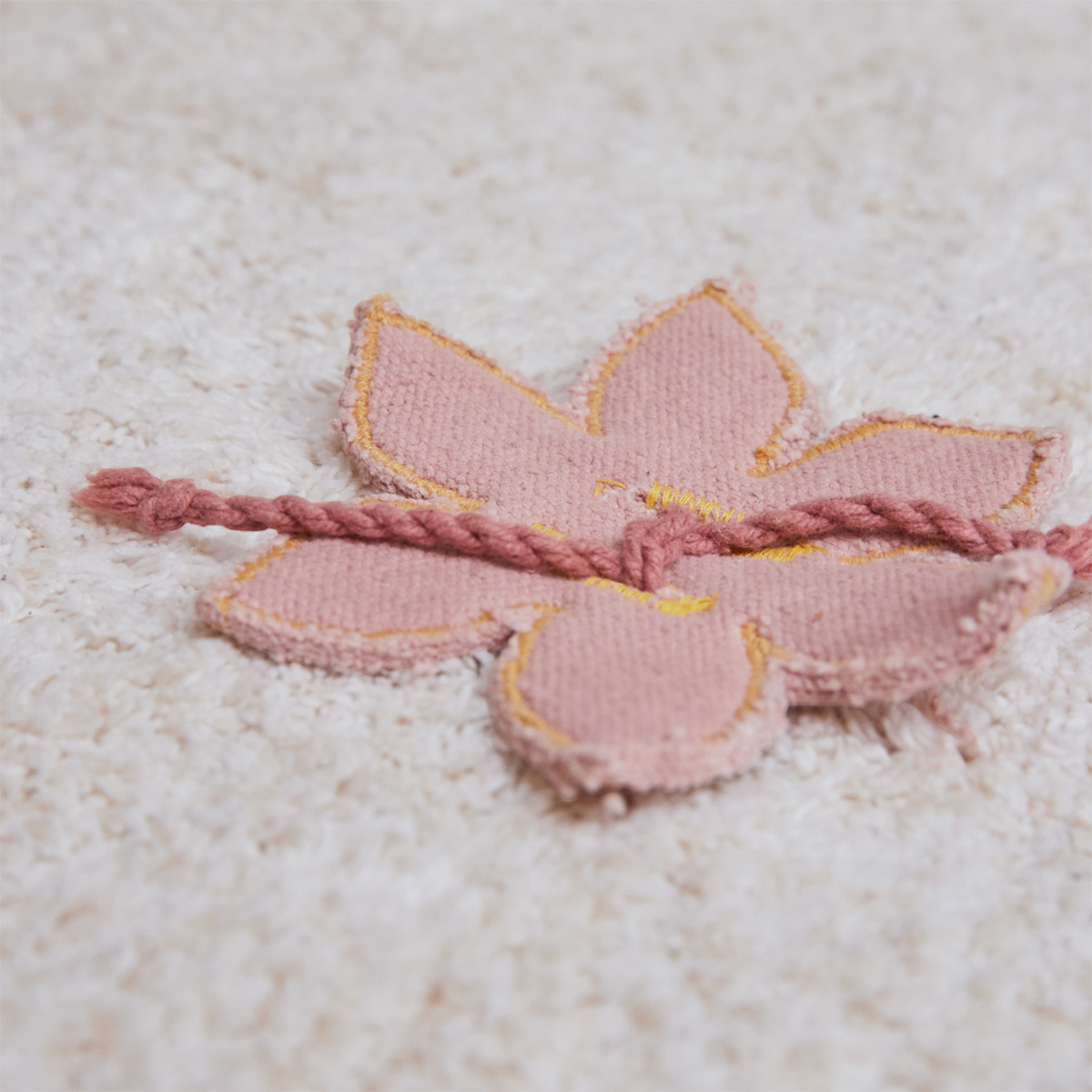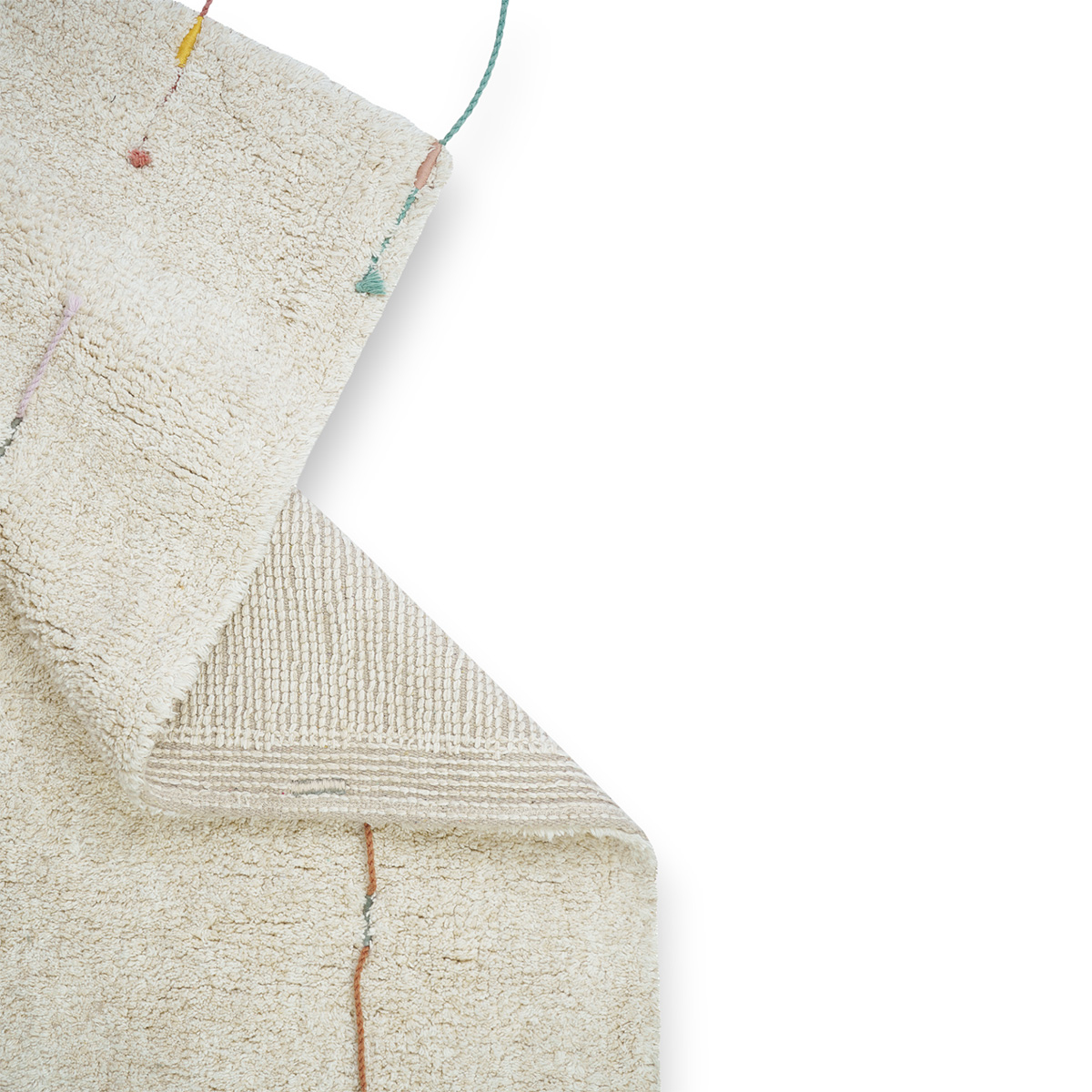 Χειροποίητο παιδικό χαλί 120x160 της εταιρείας Lorena Canals σε εκρού απόχρωση με πολύχρωμες λεπτομέρειες. Διαθέτει 14 βαμβακερά λουλουδάκια με τα οποία μπορούν να παίξουν τα παιδιά πάνω στο χαλί, τοποθετώντας τα μέσα στα κορδόνια που υπάρχουν. Είναι κατασκευασμένο από 97% βαμβάκι και 3% άλλες ανακυκλωμένες υφαντικές ίνες, με μη τοξικές βαφές. Κάθε κομμάτι είναι μοναδικό, επομένως μπορεί να υπάρχουν μικρές παραλλαγές στο σχήμα και στο χρώμα τους. Πληροί όλες τις προδιαγραφές ποιότητας και ασφάλειας για τα παιδιά, ενώ έχει πιστοποίηση ISO 9001, ISO 14001, ISO 45001.