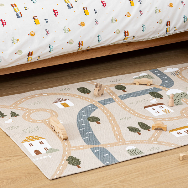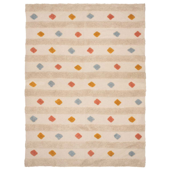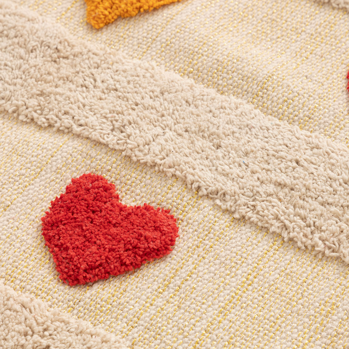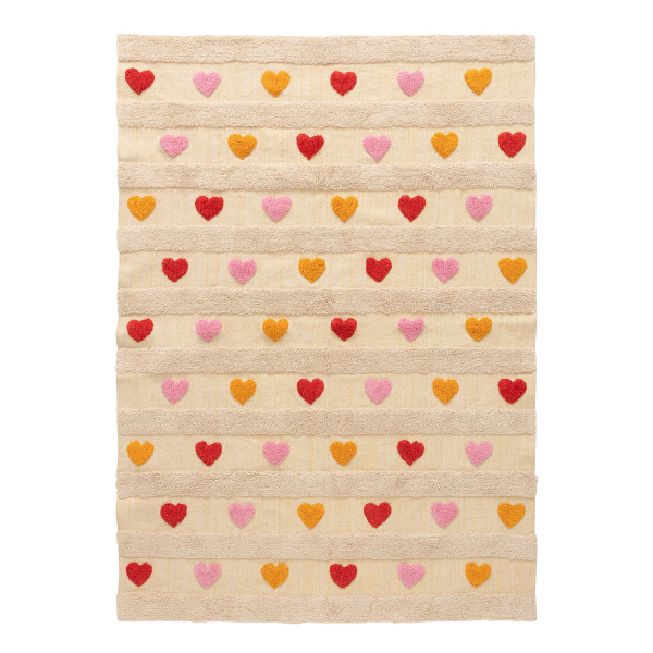 Παιδικό χαλί για το βρεφικό ή παιδικό δωμάτιο. Είναι κατασκευασμένο από 100% βαμβάκι σε μπεζ χρώμα με ροζ, κόκκινες και πορτοκαλί λεπτομέρειες και σχέδιο με καρδούλες. Διαθέτει μαλακό πάτημα και είναι κατάλληλο για ατελείωτες ώρες παιχνιδιού. Ιδανικό για να χαρίσει μια παιχνιδιάρικη διάθεση στο δωμάτιο του παιδιού σας καθόλη τη διάρκεια του χρόνου.