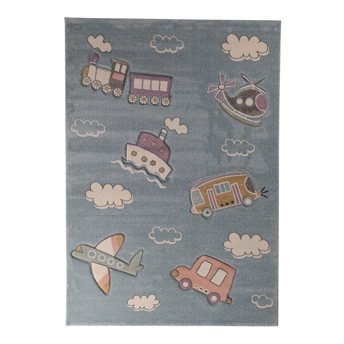 Χαλί μηχανής 133x190 από τη σειρά Diamond της εταιρείας Tzikas Carpets σε γαλάζιο φόντο με πολύχρωμες λεπτομέρειες και οχήματα στο σχέδιο. Ανθεκτικό χαλί στην σκληρή καθημερινή καταπόνηση από το παιδικό παιχνίδι. Είναι κατασκευασμένο με ανεξίτηλα νήματα από 100% frize heatset πολυπροπυλένιο. Το χαλί έχει βάρος 3.000gsm με πυκνότητα 288.000 κόμπους/τ.μ. και ύψος πέλους 13mm. Έχει ανάγλυφη επιφάνεια και το υπόστρωμά του είναι υφαντό. Είναι αντιστατικό άρα το σκούπισμα με ηλεκτρική σκούπα είναι εύκολο και αποτελεσματικό. Μπορεί να τοποθετηθεί στο παιδικό ή βρεφικό δωμάτιο. Τα χαλιά της εταιρείας Tzikas Carpets είναι υποαλλεργικά και φιλικά προς την υγεία. Έχουν πιστοποίηση του Γερμανικού ινστιτούτου Oeko-Tex Standard 100.