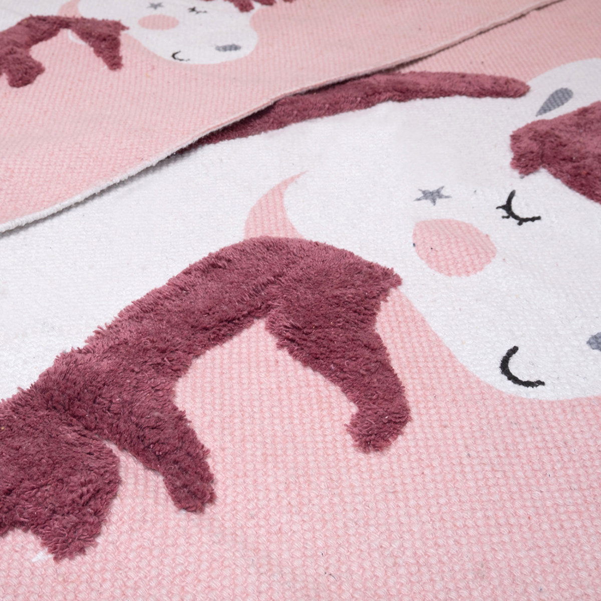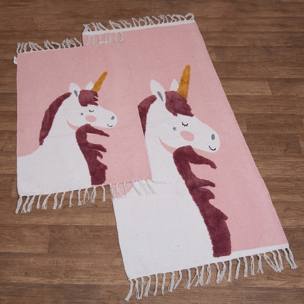 Χαλί διαδρόμου 70x140 ροζ χρώμα, με σάπιο μήλο λεπτομέρειες και μονόκερο σχέδιο από την εταιρεία Viopros. Η σύνθεση του αποτελείται από 100% βαμβάκι. Διαθέτει διακοσμητικά κρόσσια στο τελείωμα. Ιδανικό για να το τοποθετήσετε σε οποιαδήποτε γωνιά του σπιτιού σας.