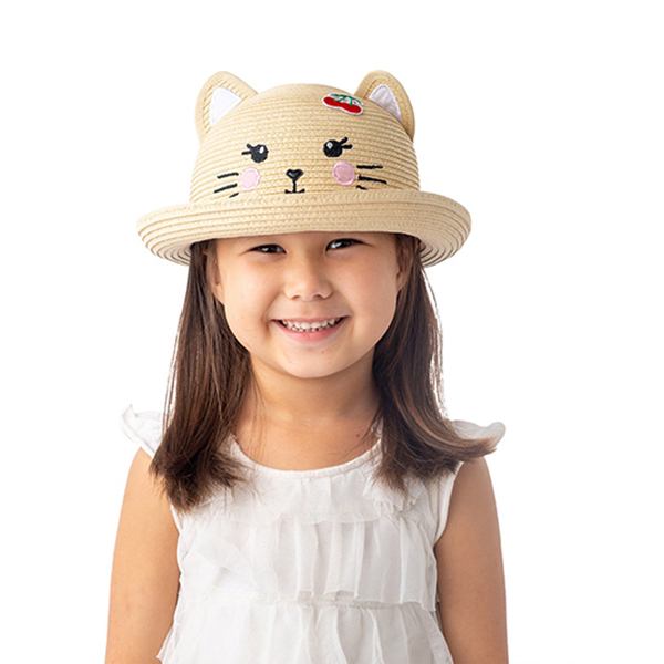 Παιδικό ψάθινο καπέλο σε μπεζ χρώμα και σχέδιο γατούλα από την εταιρία FlapjackKids. Είναι ελαφρύ με αντηλιακή προστασία UPF 50+, κατασκευασμένο από υφαντό άχυρο, ιδανικό για την παραλία, την βόλτα, τις εκδρομές κτλ. Διατίθεται για ηλικίες 2-4 ετών και ηλικίες 4-6 ετών.