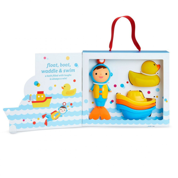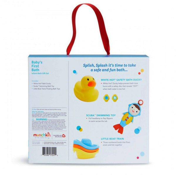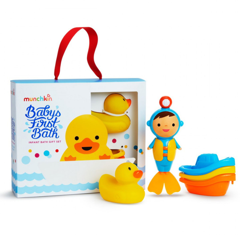 Παιχνίδια μπάνιου σετ από την εταιρεία Munchkin. Το σετ περιλαμβάνει ένα παιχνίδι μπάνιου παπάκι που επιπλέει και διαθέτει δείκτη θερμοκρασίας στο κάτω μέρος και σας ειδοποιεί ότι το νερό είναι πολύ ζεστό (ανάβει ένδειξη HOT), έναν δύτη που μόλις τραβήξετε τον κρίκο, αρχίζει και κολυμπάει μέσα στον νερό, και 3 καραβάκια που επιπλέουν, γεμίζουν με νερό και συνδέονται μεταξύ τους. Ιδανικό σετ δώρου για παιδιά άνω των 12 μηνών.