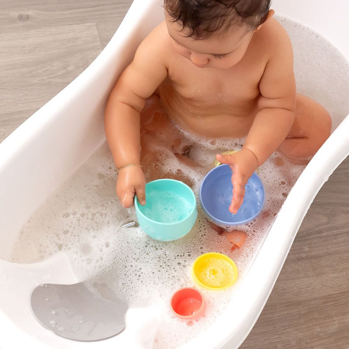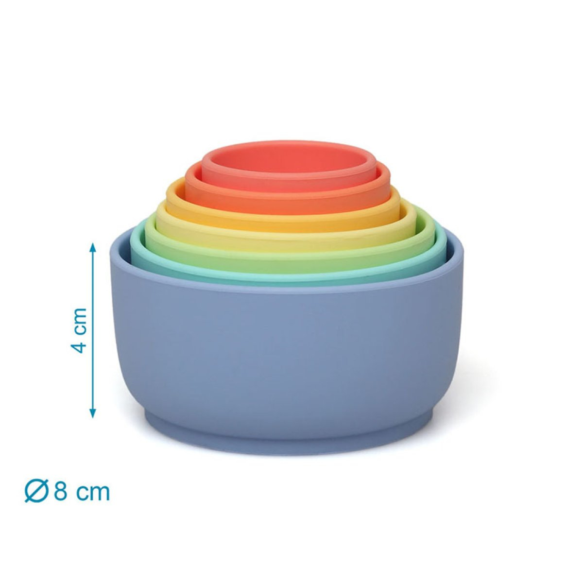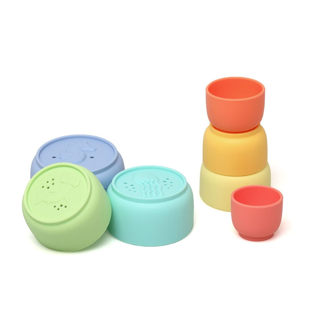 Παιχνίδια μπάνιου σετ από την εταιρία Kiokids. Είναι φτιαγμένα από υψηλής ποιότητας σιλικόνη, οπότε είναι πολύ μαλακά, ανθεκτικά και καθαρίζονται πανεύκολα. Είναι εντελώς απαλλαγμένα από BPA και άλλες βλαβερές ουσίες. Το σετ περιλαμβάνει 7 κυπελάκια σχεδιασμένα ειδικά για το παιχνίδι στο νερό. Βοηθούν το μικρό σας να αναπτύξει τις αισθήσεις και τις κινητικές του δεξιότητες την ώρα που απολαμβάνει το μπάνιο του! Μπορεί να τα στοιβάζει φτιάχνοντας έναν ψηλό πύργο, να τα βάζει το ένα μέσα στο άλλο για εύκολη αποθήκευση ή να τα χρησιμοποιεί για να μαζεύει νερό και να κάνει σχέδια με τις σαπουνάδες. Κατάλληλο για ηλικίες 5+ μηνών.