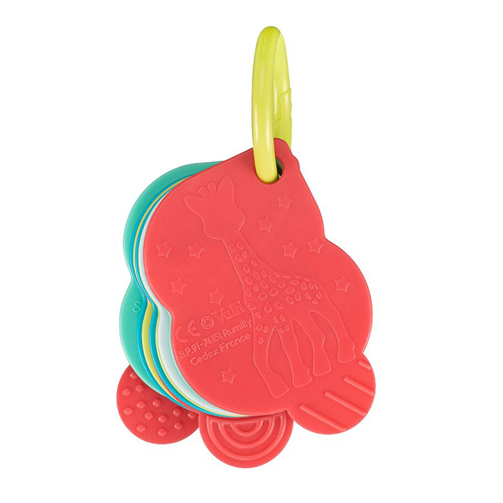 Παιχνίδι δραστηριοτήτων από την Σόφι την καμηλοπάρδαλη που μαθαίνει στο παιδί τους αριθμούς. Ο κρίκος με τις κάρτες θυμίζουν τα κλειδιά σας κι αυτό εξιτάρει την περιέργειά του. Απλές και εκπαιδευτικές εικόνες, μαθαίνουν στο μωρό να ταιριάζει τους αριθμούς με την ποσότητα. Το μεγάλο σχήμα των καρτών και τα λαμπερά χρώματα θα τραβήξουν την προσοχή του. Το εύχρηστο και ανοιγόμενο δαχτυλίδι σας επιτρέπει να το κρεμάσετε όπου θέλετε και να αφαιρέσετε τις κάρτες τοποθετώντας την μια δίπλα στην άλλη. Οι κάρτες είναι κατασκευασμένες από τρία διαφορετικά μαλακά υλικά και μπορούν να χρησιμοποιηθούν και σαν μασητικό. Ιδανικό για αγοράκια και κοριτσάκια. Κατάλληλο για ηλικίες 3+ μηνών.