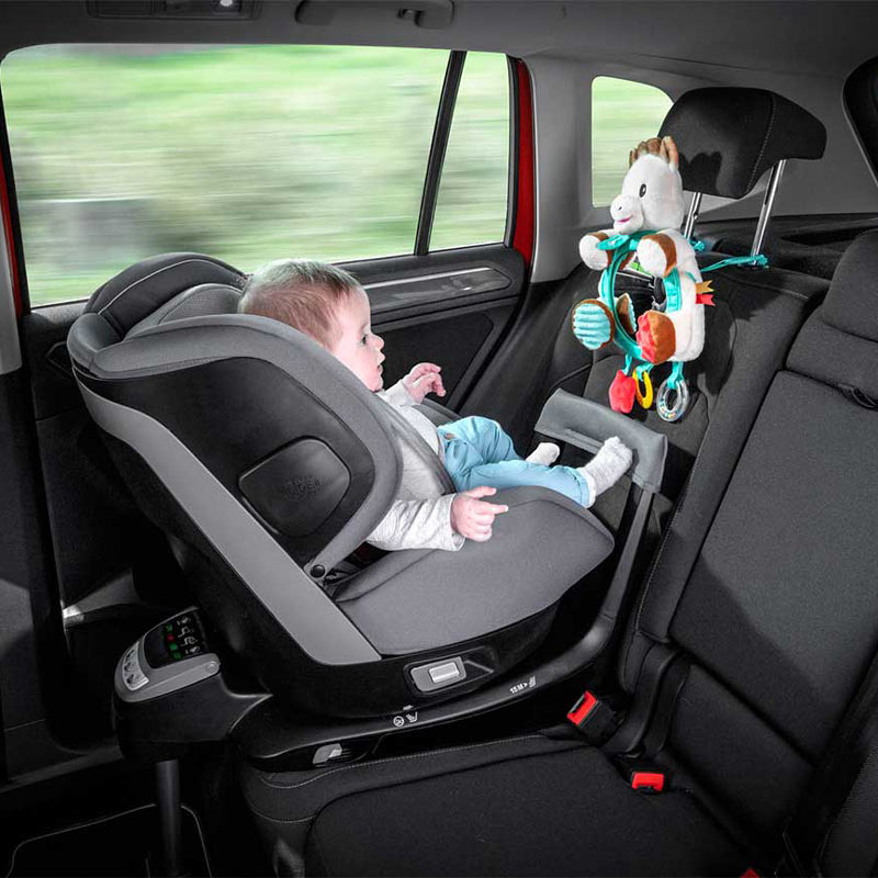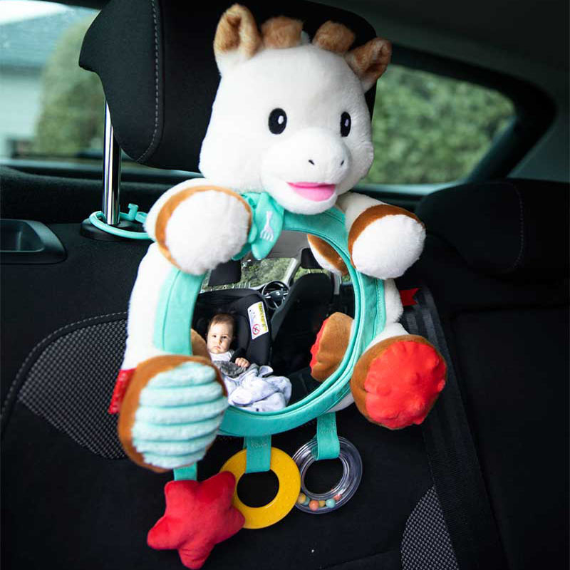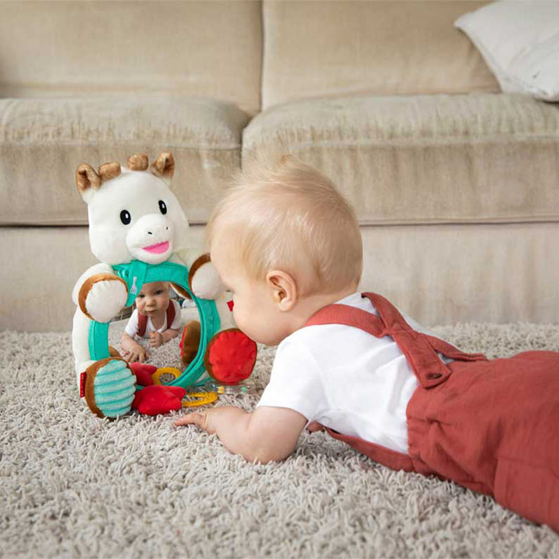 Παιχνίδι δραστηριοτήτων από την Σόφι την καμηλοπάρδαλη με μεγάλο καθρέφτη που ψυχαγωγεί και εκαιδεύει το μωρό σας. Διαθέτει αναρτήρες για να το κρεμάσετε στο καρότσι ή την κούνια αλλά και στο κάθισμα του αυτοκινήτου ώστε να βλέπετε το μωρό ενώ οδηγείτε. Με ειδική βάση στο πίσω μέρος για να μπορείτε να το τοποθετήσετε σε επίπεδη επιφάνεια. Τα κρεμαστά παιχνίδια του διεγείρουν τις αισθήσεις του μωρού, ενώ ταυτόχρονα το διασκεδάζουν. Με μικρό κουδουνάκι στο δεξί πόδι της Σόφι, ήχο τσαλακωμένου χαρτιού στο αρισερό πόδι, κρεμαστό αστεράκι με ήχο, διάφανη κουδουνίστρα με πολύχρωμες μπίλιες εσωτερικά και μασητικό που ανακουφίζει από τον πόνο την περίοδο της οδοντοφυΐας. Κατασκευασμένο από απαλά υφάσματα διαφόρων υφών. Κατάλληλο από την γέννηση.