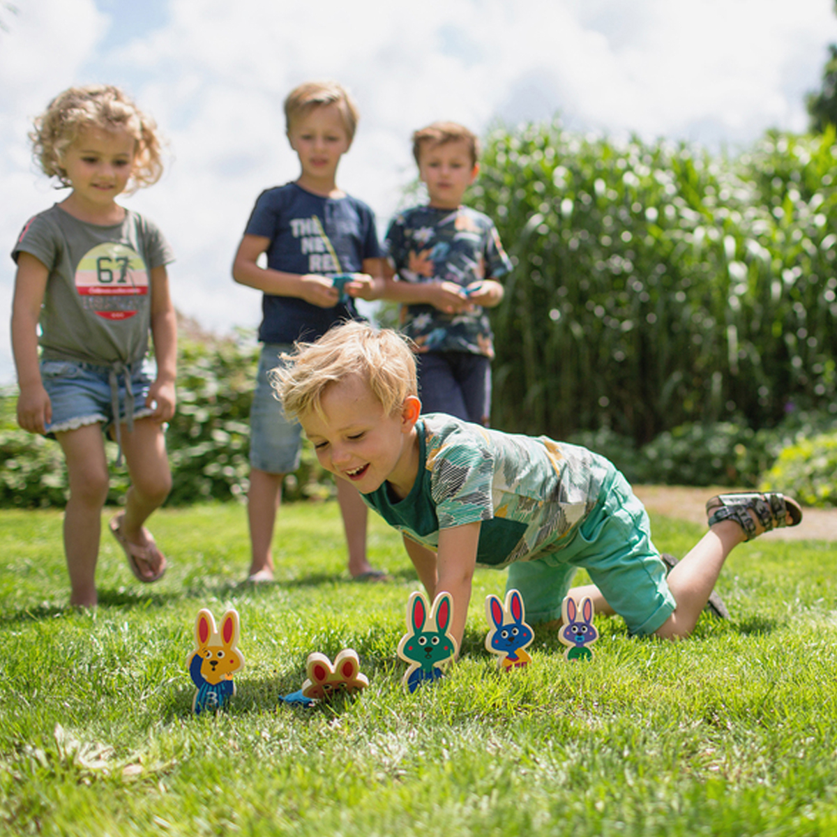 Παιχνίδι δραστηριότητας από την εταιρία Bs Toys. Είναι κατάλληλο για ηλικίες 3+ ετών και είναι ξύλινο με υφασμάτινα μαξιλαράκια. Τοποθετήστε στο πάτωμα τα ξύλινα κουνελάκια και με τα μαξιλαράκια, προσπαθήστε να τα στοχεύσετε και να τα ρίξετε. Το κάθε κουνελάκι έχει και έναν αριθμό στην πίσω πλευρά που αντιπροσωπεύει τους πόντους. Ιδανικό και για παιχνίδι έξω από το σπίτι!