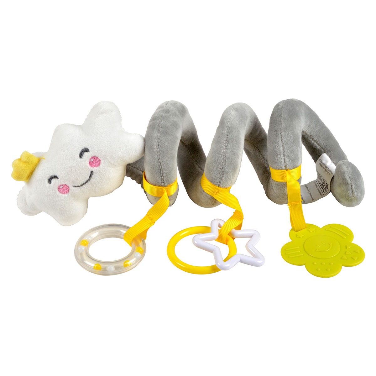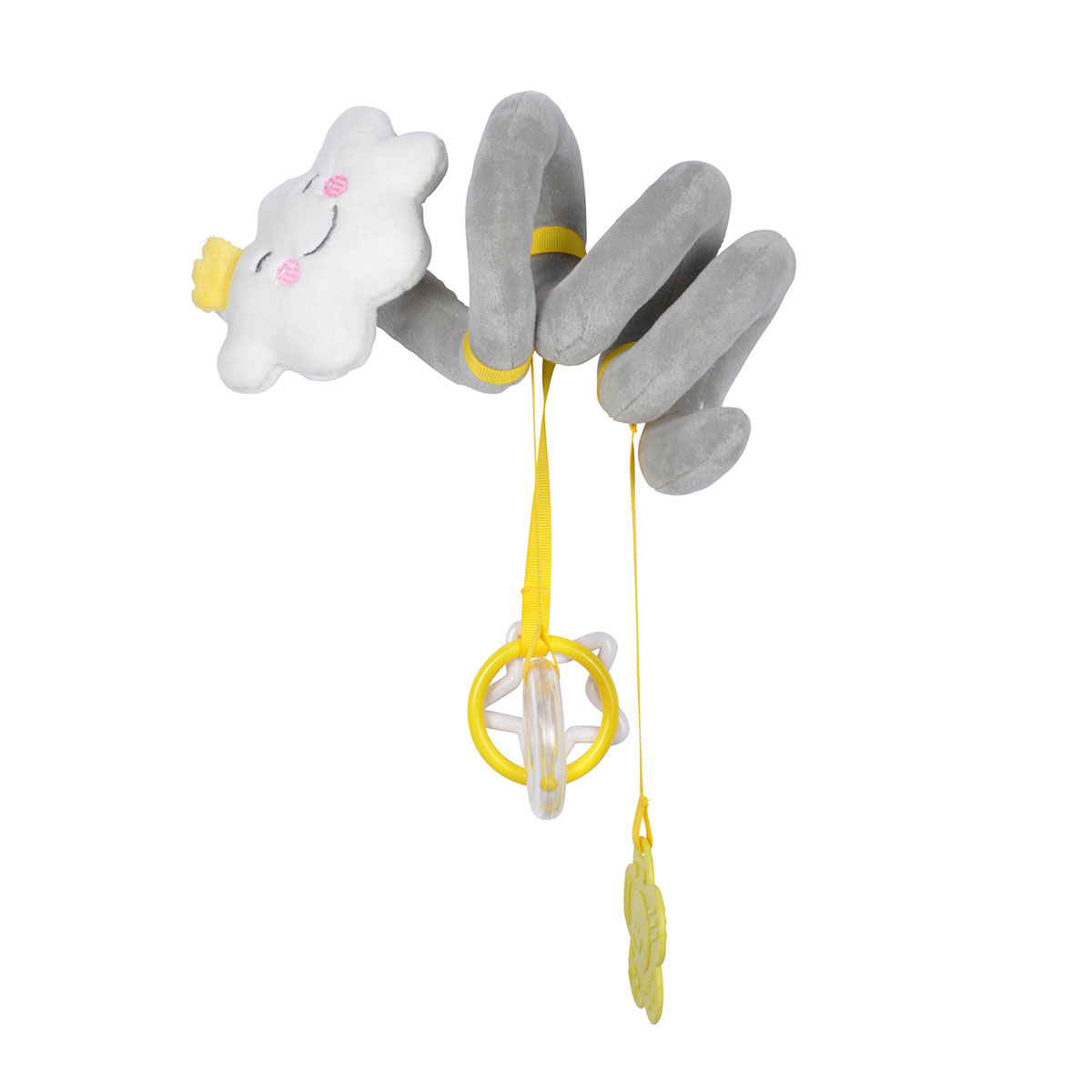 Μαλακό σπιράλ δραστηριοτήτων σε γκρι χρώμα και σχέδιο συννεφάκι. Κατασκευασμένο από 100% Polyester που το καθιστά εξαιρετικά απαλό και ανθεκτικό. Μπορεί να κρεμαστεί σε βρεφική κούνια, κρεβατάκι, καροτσάκι, κλπ. Διαθέτει πάνω διάφορα παιχνιδάκια που κεντρίζουν το ενδιαφέρον του μωρού σας.