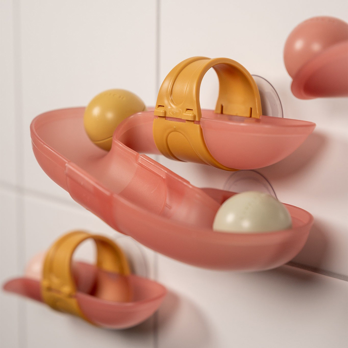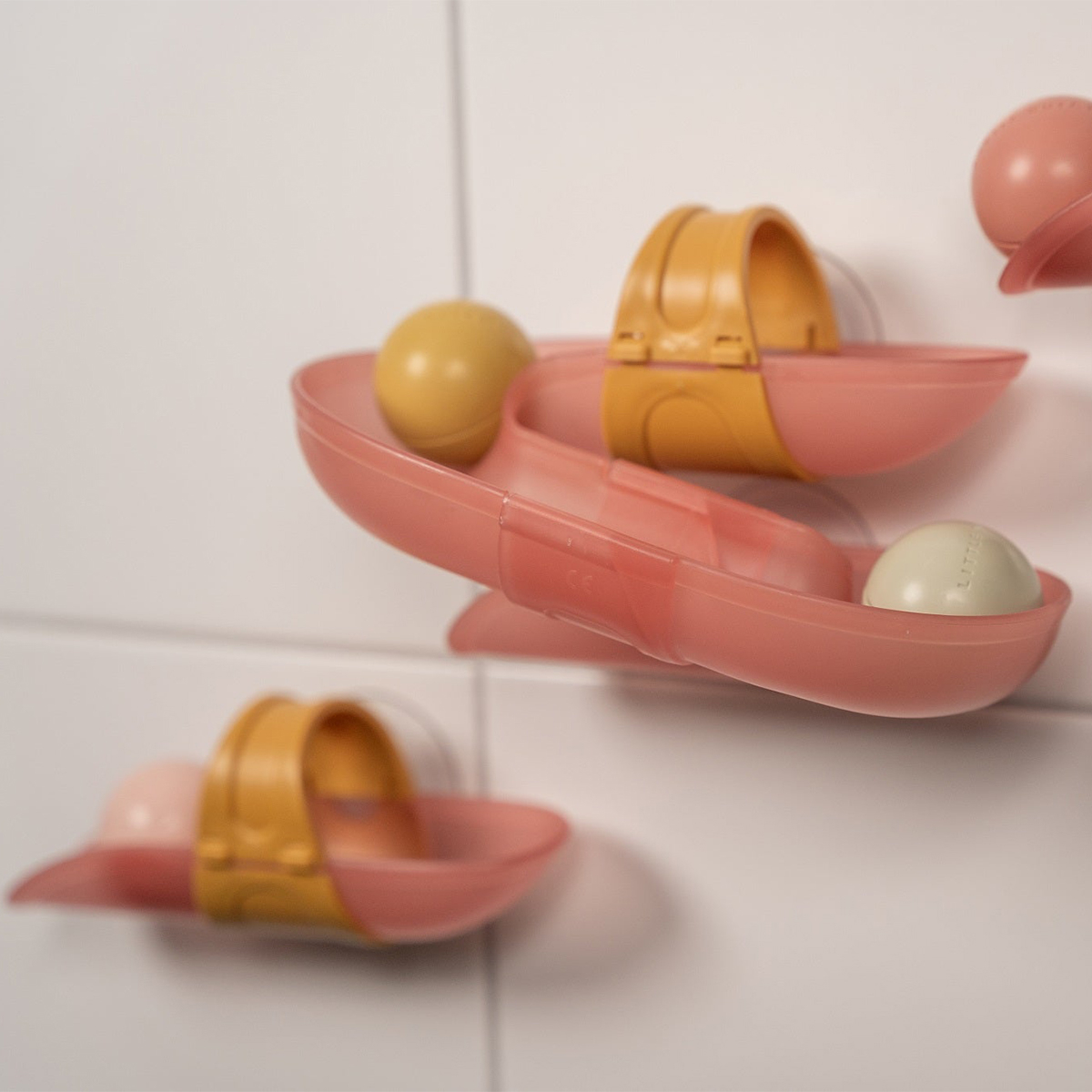 Παιχνίδι μπάνιου σε ροζ χρώμα με μουσταρδί λεπτομέρειες από την εταιρεία Little Dutch. Αποτελείται από 4 κομμάτια με βεντούζα στο πίσω μέρος για να κολλάνε στον τοίχο και 4 πολύχρωμες μπαλίτσες. Κρεμάστε τον υδάτινο διάδρομο στον τοίχο του μπάνιου και αφήστε τις μπάλες να κυλήσουν. Αν θέλετε οι μπάλες να κυλήσουν πιο γρήγορα, απλά προσθέστε λίγο νερό. Χάρη στα διαφορετικά σχήματα του διαδρόμου, μπορείτε να δημιουργήσετε ατελείωτες διαδρομές. Απολαυστικό παιχνίδι που βοηθά τις λεπτές κινητικές δεξιότητες και την δεξιότητα επίλυσης προβλημάτων. Κατάλληλο για παιδιά 10+ μηνών.