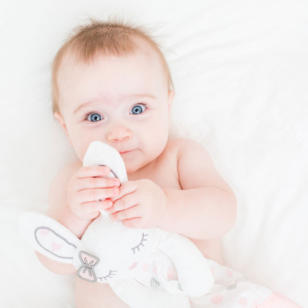 Βρεφικό ντουντού από την εταιρεία Lulujo σε λευκό χρώμα με ροζ λεπτομέρειες και κουνελάκι στο σχέδιο. Είναι κατασκευασμένη από απαλή μουσελίνα, 100% βαμβακερό ύφασμα. Είναι εξαιρετικά απαλό για να νιώθει ασφάλεια και άνεση, ιδιαίτερα κατά την διάρκεια του ύπνου. Κατάλληλο από από την γέννηση.