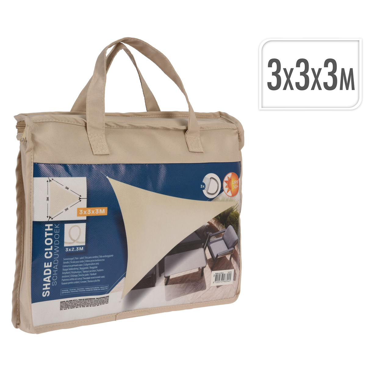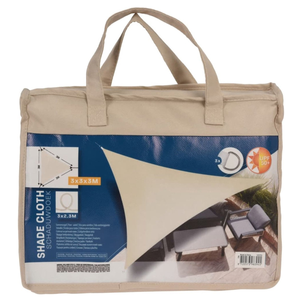 Τριγωνικό σκίαστρο σε μπεζ χρώμα με διάσταση 3x3x3 μέτρα. Διαθέτει 3 σχοινιά ασφαλείας μήκους 2.3 μέτρα το καθένα και δακτυλίους στις γωνίες για εύκολη στερέωση. Το ύφασμα είναι από 100% polyester, βάρους 170gr/m2 και είναι αδιάβροχο με επεξεργασία που επιτρέπει στο νερό να γλιστράει χωρίς να διεισδύει στο υλικό. Έχει δείκτη αντιηλιακής προστασίας UPF 50+ για να προσφέρει μεγαλύτερη ασφάλεια από τον ήλιο. Μπορεί να τοποθετηθεί στην ταράτσα, στο μπαλκόνι, στον κήπο ή ακόμη και στο camping. Διαθέτει τσάντα μεταφοράς.