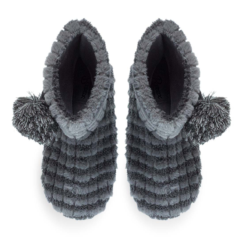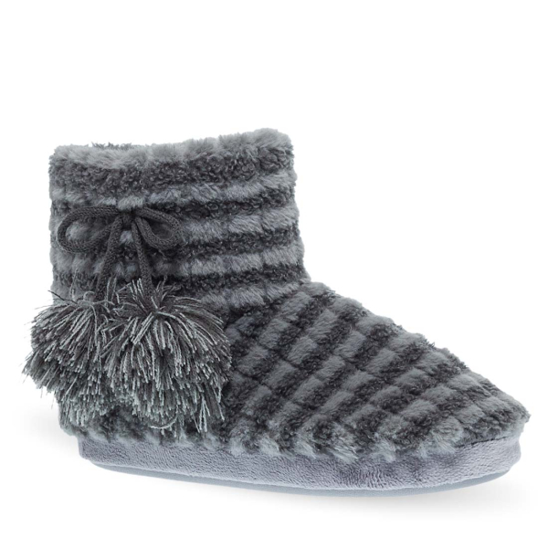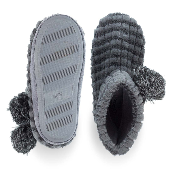 Γυναικείες χειμωνιάτικες παντόφλες σε στυλ μποτάκια από την εταιρεία Parex σε γκρι αποχρώσεις με πομ-πον. Έχουν ριγέ σχέδιο. Διαθέτουν απαλό και ζεστό ύφασμα και χνουδωτή εξωτερική επιφάνεια, που τις καθιστά ιδιαίτερα ζεστές. Έχουν επίσης εξαιρετικά μαλακό και αναπαυτικό πάτο για ξεκούραστα βήματα. Η σόλα είναι εύκαμπτη και αντιολισθητική, για άνεση και ασφάλεια. Το ύψος του τακουνιού είναι 2,5εκ. και το ύψος της φιάπας είναι 2εκ. Αποτελούν την ιδανική επιλογή για τις κρύες ημέρες του χειμώνα. Είναι ανθεκτικές και μπορείτε εύκολα να τις διατηρείται καθαρές, καθώς πλένονται στο πλυντήριο στους 30°C ( χωρίς στύψιμο). Με την υπογραφή της εταιρείας Parex για άριστη ποιότητα και αξιοπιστία.