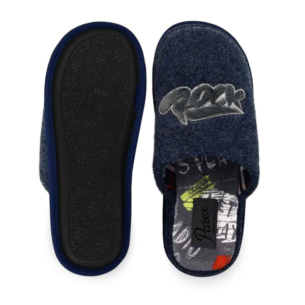 Εφηβικές χειμωνιάτικες παντόφλες από την εταιρεία Parex σε μπλε απόχρωση. Έχουν κεντημένο σχέδιο με την επιγραφή Rock σε μοντέρνο και πολύχρωμο μοτίβο στην πάτο. Διαθέτουν απαλό ύφασμα και εξαιρετικά μαλακό και αναπαυτικό πάτο για ξεκούραστα βήματα. Η σόλα είναι εύκαμπτη και αντιολισθητική, για άνεση και ασφάλεια. Το ύψος του τακουνιού είναι 2,5εκ. και το ύψος της φιάπας είναι 1,5εκ. Αποτελούν την ιδανική επιλογή για τις κρύες ημέρες του χειμώνα. Είναι ανθεκτικές και μπορείτε εύκολα να τις διατηρείται καθαρές, καθώς πλένονται στο πλυντήριο στους 30°C ( χωρίς στύψιμο). Με την υπογραφή της εταιρείας Parex για άριστη ποιότητα και αξιοπιστία.