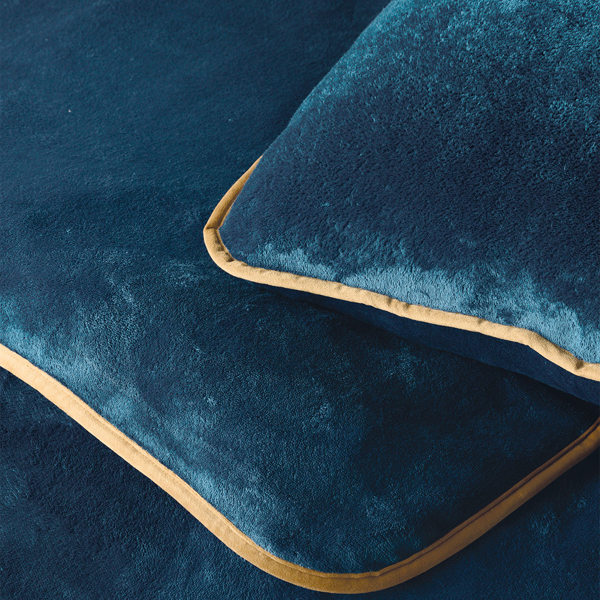 Ημίδιπλη βελουτέ παπλωματοθήκη από την εταιρεία Kentia σε μπλε χρώμα και μπεζ περιμετρικό ρέλι. Το βελουτέ ύφασμά της από 100% polyester βάρους 200gsm την καθιστά πολύ ζεστή και απαλή. Ιδανική για τους χειμερινούς μήνες. Συνδυάστε την με τα υπόλοιπα προϊόντα της ίδιας σειράς για ένα ολοκληρωμένο αποτέλεσμα.