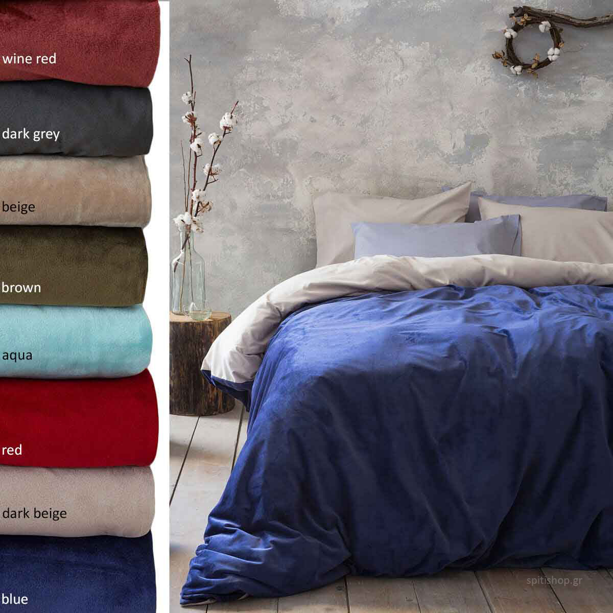 Υπέρδιπλη βελουτέ παπλωματοθήκη από την εταιρεία Nima με επιλογή ανάμεσα σε 4 συνδυασμούς χρωμάτων. Η εξωτερική πλευρά είναι 100% polyester με βελουτέ υφή και η εσωτερική είναι 100% microfiber. Κλείνει στο κάτω μέρος με φερμουάρ. Συσκευασία σε σακούλα PVC.