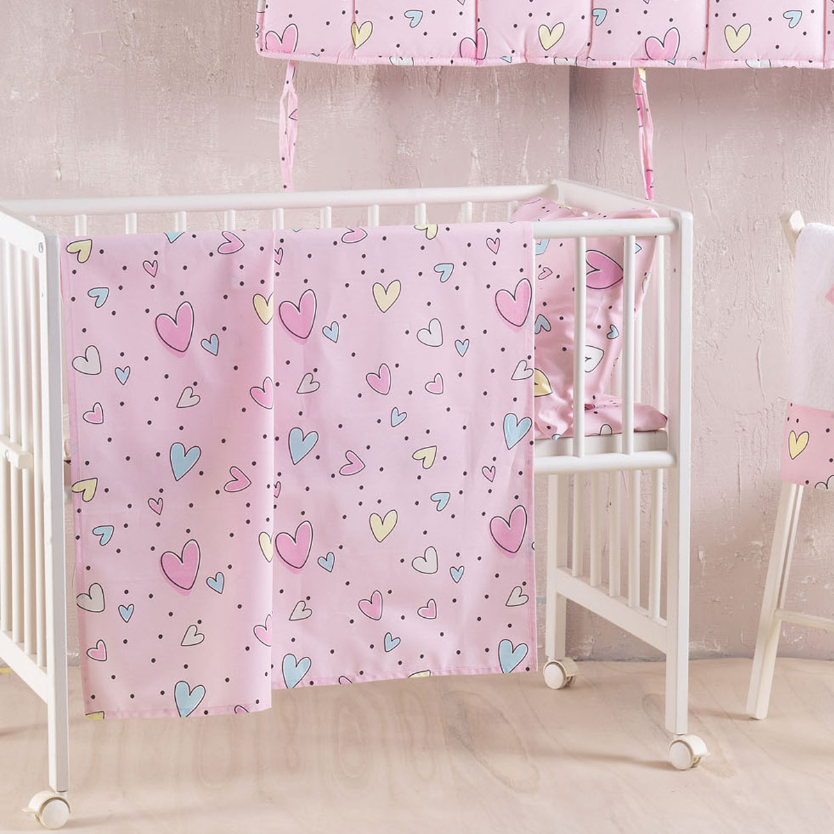Βρεφική παπλωματοθήκη για το πάπλωμα του μωρού σας σε ροζ χρώμα, με πολύχρωμες λεπτομέρειες και σχέδιο καρδιές από την εταιρεία Rythmos. Η ποιότητά της από 100% βαμβάκι 144 κλωστών, προσφέρει απαλότητα και ανθεκτικότητα. *Στο σετ περιλαμβάνεται η μαξιλαροθήκη με το σχέδιο του πανωσέντονου. ** Συνδυάστε την με τα υπόλοιπα είδη του ίδιου σχεδίου για ένα ολοκληρωμένο αποτέλεσμα.