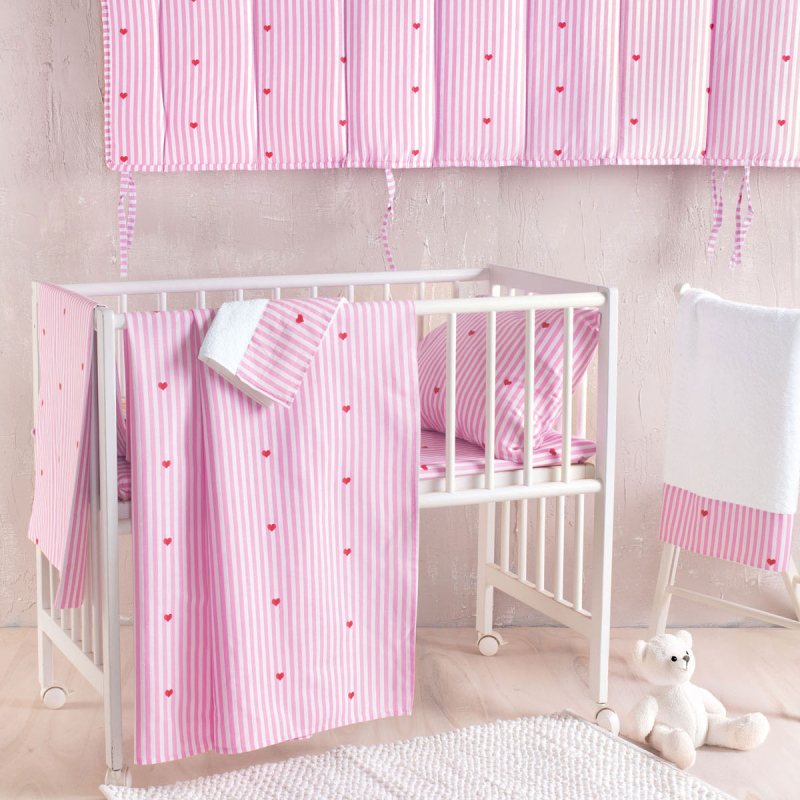 Βρεφική παπλωματοθήκη για το πάπλωμα του μωρού σας σε ροζ χρώμα, με κόκκινες λεπτομέρειες και σχέδιο καρδιές από την εταιρεία Rythmos. Η ποιότητά της από 100% βαμβάκι 144 κλωστών, προσφέρει απαλότητα και ανθεκτικότητα. *Στο σετ περιλαμβάνεται η μαξιλαροθήκη με το σχέδιο του πανωσέντονου. ** Συνδυάστε την με τα υπόλοιπα είδη του ίδιου σχεδίου για ένα ολοκληρωμένο αποτέλεσμα.