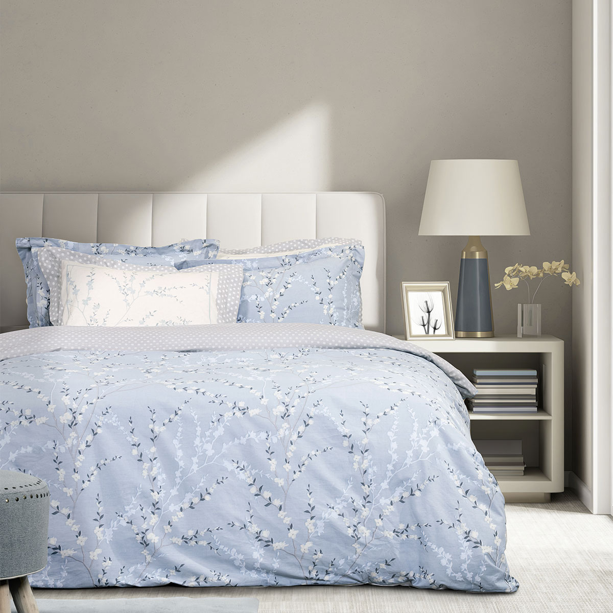 Σετ μονή παπλωματοθήκη σε γαλάζιο χρώμα, με λευκές λεπτομέρειες και φλοράλ σχέδιο από την εταιρεία Nima. Το ύφασμα είναι 100% βαμβάκι 144 κλωστών, απαλό και ανθεκτικό. Η μαξιλαροθήκη oxford είναι διπλής όψης. Η παπλωματοθήκη είναι διπλής όψης με τη μία μεριά να έχει το σχέδιο του πανωσέντονου και την άλλη του κατωσέντονου. Συνδυάστε την με τα υπόλοιπα είδη του ίδιου σχεδίου για ένα ολοκληρωμένο αποτέλεσμα.