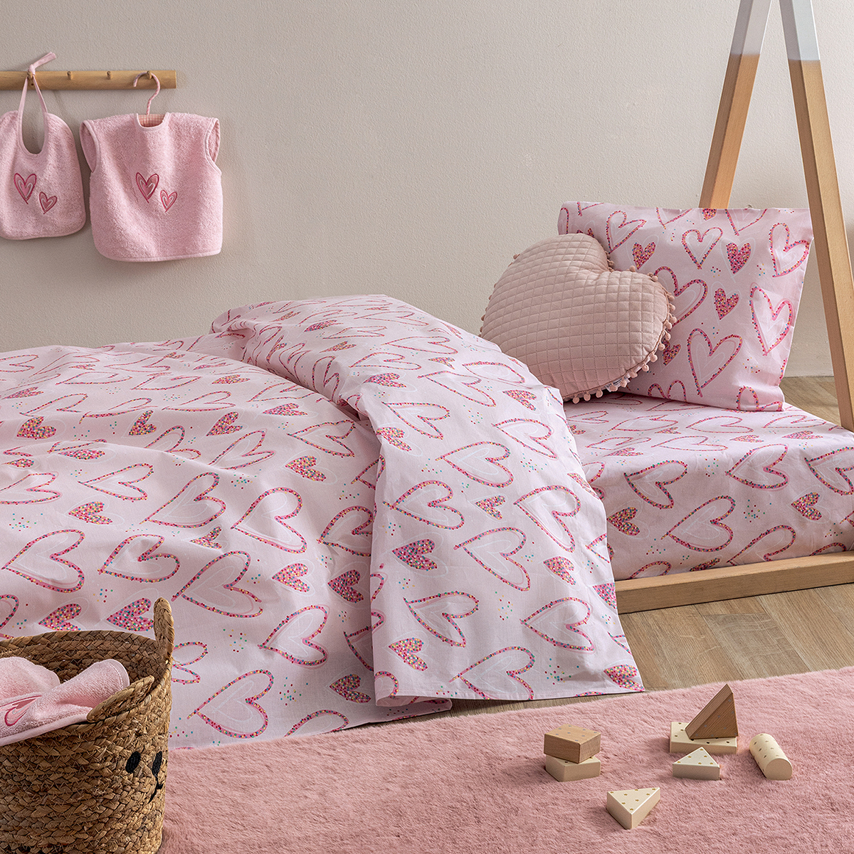 Σετ μονή παπλωματοθήκη σε ροζ χρώμα και σχέδιο καρδιές από την εταιρεία Palamaiki. Το ύφασμα είναι 100% βαμβάκι 144 κλωστών. Στο σετ περιλαμβάνεται η μαξιλαροθήκη φάκελος. Συνδυάστε τα με τα υπόλοιπα είδη της ίδιας σειράς για ένα ολοκληρωμένο αποτέλεσμα.