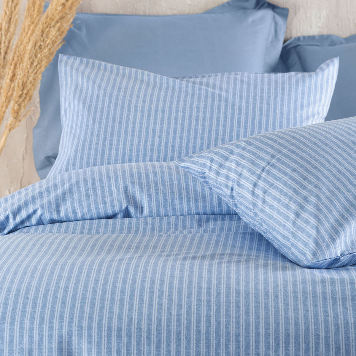 Μονή παπλωματοθήκη με φερμουάρ σε μπλε χρώμα, με λευκές λεπτομέρειες και ριγέ σχέδιο από την εταιρεία Rythmos. Είναι κατασκευασμένη από 50% polyester 50% βαμβάκι 144 κλωστών, που προσφέρει απαλότητα και ανθεκτικότητα. Στο σετ περιλαμβάνεται η μαξιλαροθήκη φάκελος με το σχέδιο του πανωσέντονου. **Το σχέδιο στις μαξιλαροθήκες ενδέχεται να διαφέρει από αυτό της φωτογραφίας, καθώς η εταιρεία παράγει μαξιλαροθήκες από όλο το σχέδιο του υφάσματος και τις συσκευάζει με τυχαία σειρά.** Συνδυάστε τα με τα υπόλοιπα προϊόντα του ίδιου σχεδίου για ένα ολοκληρωμένο αποτέλεσμα.