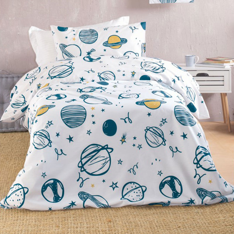 Μονή παπλωματοθήκη με φερμουάρ σε λευκό χρώμα, με μπλε λεπτομέρειες και σχέδιο διάστημα από την εταιρεία Rythmos. Η ποιότητά της από 100% βαμβάκι 144 κλωστών την καθιστά απαλή και ανθεκτική. *Στο σετ περιλαμβάνεται η μαξιλαροθήκη με το σχέδιο του πανωσέντονου. ** Συνδυάστε την με τα υπόλοιπα προϊόντα της ίδιας σειράς για ένα ολοκληρωμένο αποτέλεσμα.