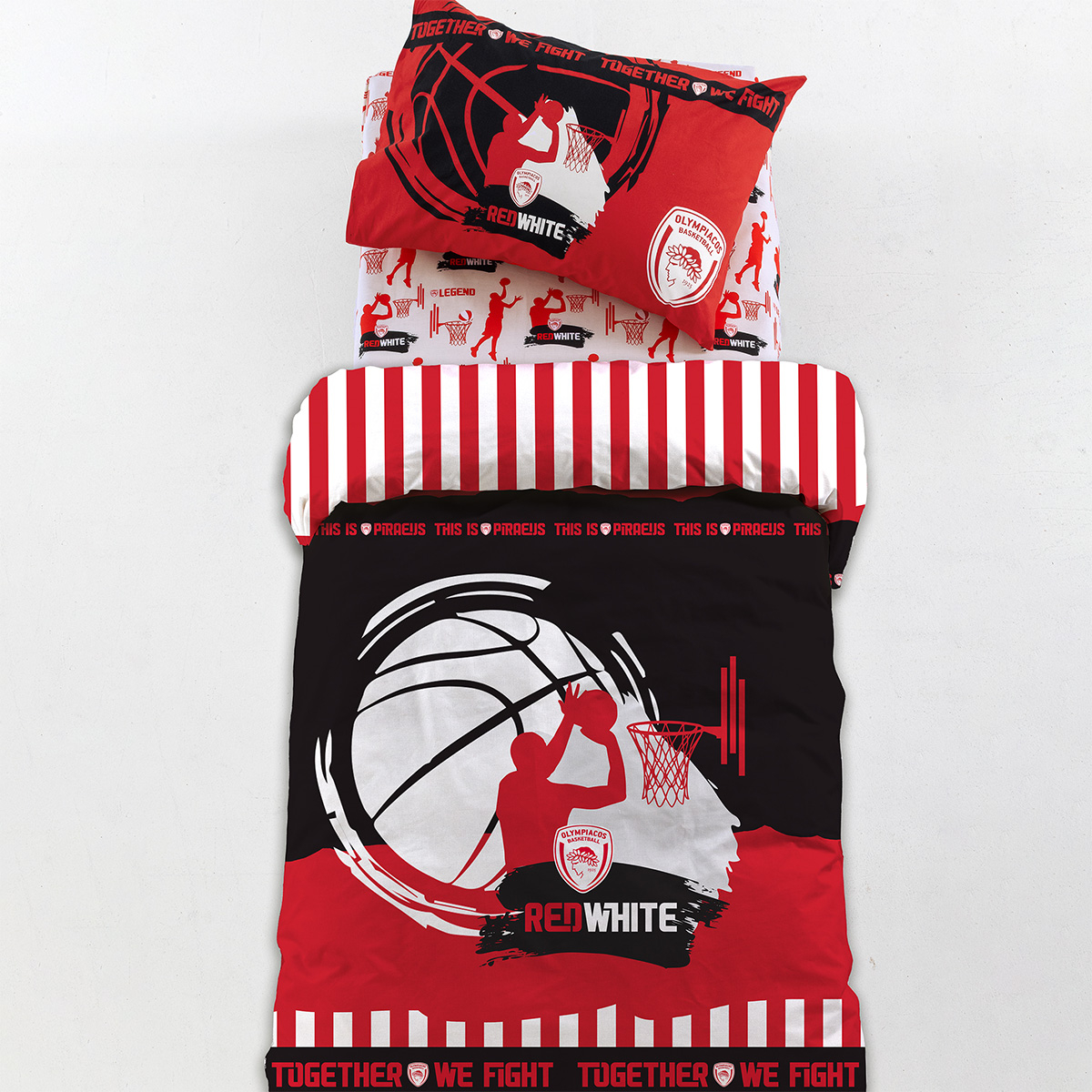 Σετ παπλωματοθήκη από την Official Licensed σειρά Ολυμπιακός της εταιρείας Palamaiki. Είναι κατασκευασμένη από 100% βαμβάκι 144 κλωστών, σε κόκκινο, μαύρο και γκρι χρώμα. Η μαξιλαροθήκη είναι φάκελος με το ίδιο σχέδιο. Το σχέδιο έχει εκτυπωθεί με τη μέθοδο της ψηφιακής εκτύπωσης (digital print) που προσφέρει έντονα χρώματα, υψηλή ευκρίνεια και μεγάλη αντοχή στο χρόνο.