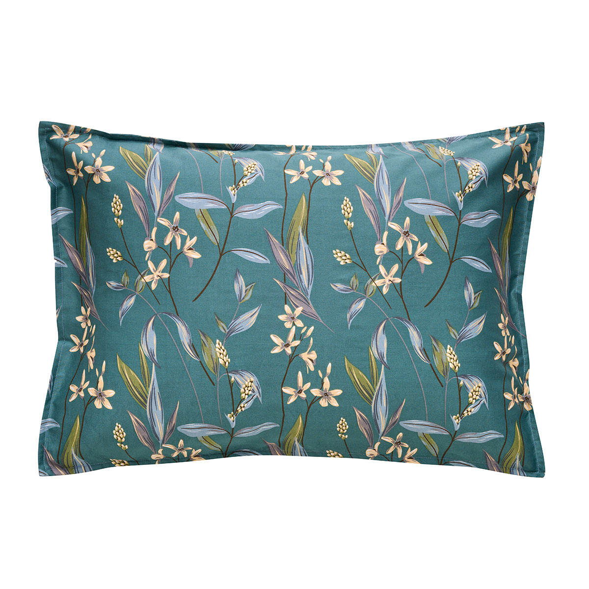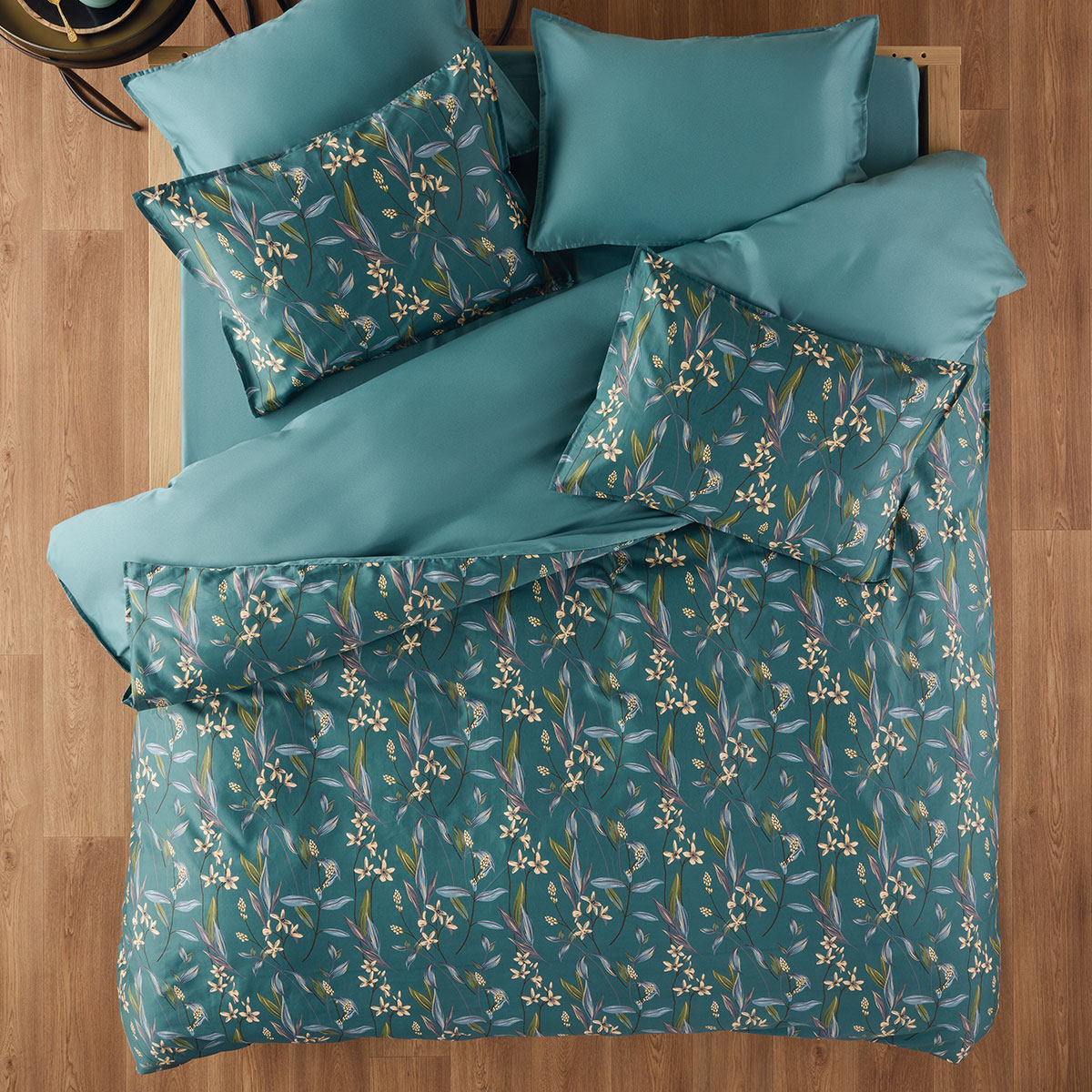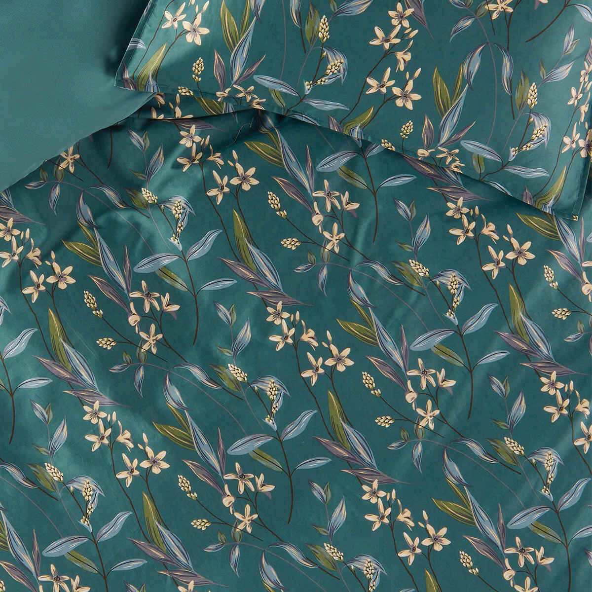 Σετ υπέρδιπλη παπλωματοθήκη από την εταιρεία Kentia. Έχουν φλοράλ σχέδιο σε πετρόλ απόχρωση με εκρού-γκρι-πράσινες λεπτομέρειες. Το ύφασμα είναι 100% βαμβακοσατέν 300 κλωστών, εξαιρετικής ποιότητας, που προσφέρει πολύ απαλή υφή και ανθεκτικότητα. Είναι διπλής όψης, η μία μεριά έχει το σχέδιο του πανωσέντονου και η άλλη το σχέδιο του κατωσέντονου. Οι μαξιλαροθήκες είναι με περιμετρικό πλαίσιο (τύπος oxford) και έχουν το σχέδιο του πανωσέντονου. Συνδυάστε την με τα υπόλοιπα προϊόντα του ίδιου σχεδίου για ένα ολοκληρωμένο αποτέλεσμα.