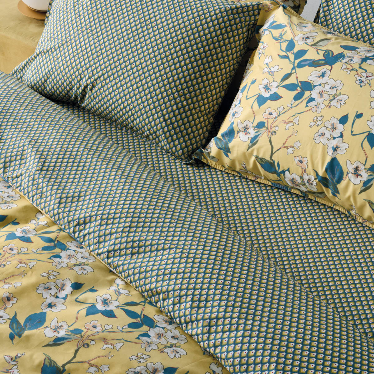 Σετ υπέρδιπλη παπλωματοθήκη με περιμετρικό πλαίσιο από την εταιρεία Kentia σε κίτρινο χρώμα με εκρού-μπλε λεπτομέρειες και φλοράλ σχέδιο. Το ύφασμα είναι 100% βαμβακοσατέν 260 κλωστών, εξαιρετικής ποιότητας, που προσφέρει πολύ απαλή και ανάλαφρη υφή. Είναι διπλής όψης καθώς η μία μεριά έχει το σχέδιο του πανωσέντονου και η άλλη το σχέδιο του κατωσέντονου. Οι μαξιλαροθήκες είναι στο σχέδιο του πανωσέντονου και έχουν περιμετρικό πλαίσιο (τύπος oxford). Συνδυάστε την με τα υπόλοιπα προϊόντα του ίδιου σχεδίου για ένα ολοκληρωμένο αποτέλεσμα.**Το σχέδιο στις μαξιλαροθήκες ενδέχεται να διαφέρει από αυτό της φωτογραφίας καθώς η εταιρεία παράγει μαξιλαροθήκες από όλο το σχέδιο του υφάσματος και τις συσκευάζει με τυχαία σειρά. **