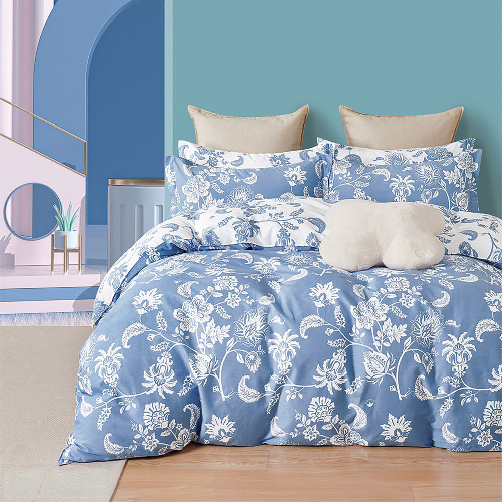 Υπέρδιπλη παπλωματοθήκη με φερμουάρ σε μπλε χρώμα με λευκές λεπτομέρειες και φλοράλ σχέδιο από την εταιρεία Rythmos. Είναι κατασκευασμένη από 100% βαμβακοσατέν 200 κλωστών που την καθιστά εξαιρετικά μαλακή, ανθεκτική και εύκολη στο σιδέρωμα. Η παπλωματοθήκη είναι διπλής όψης αφού από την μια μεριά έχει το σχέδιο του πανωσέντονου και από την άλλη μεριά το σχέδιο του κατωσέντονου. Στο σετ περιλαμβάνονται οι μαξιλαροθήκες oxford με το σχέδιο του πανωσέντονου. Συνδυάστε τη με τα υπόλοιπα προϊόντα του ίδιου σχεδίου για ένα ολοκληρωμένο αποτέλεσμα.**Το σχέδιο στις μαξιλαροθήκες ενδέχεται να διαφέρει από αυτό της φωτογραφίας, καθώς η εταιρεία παράγει μαξιλαροθήκες από όλο το σχέδιο του υφάσματος και τις συσκευάζει με τυχαία σειρά.**