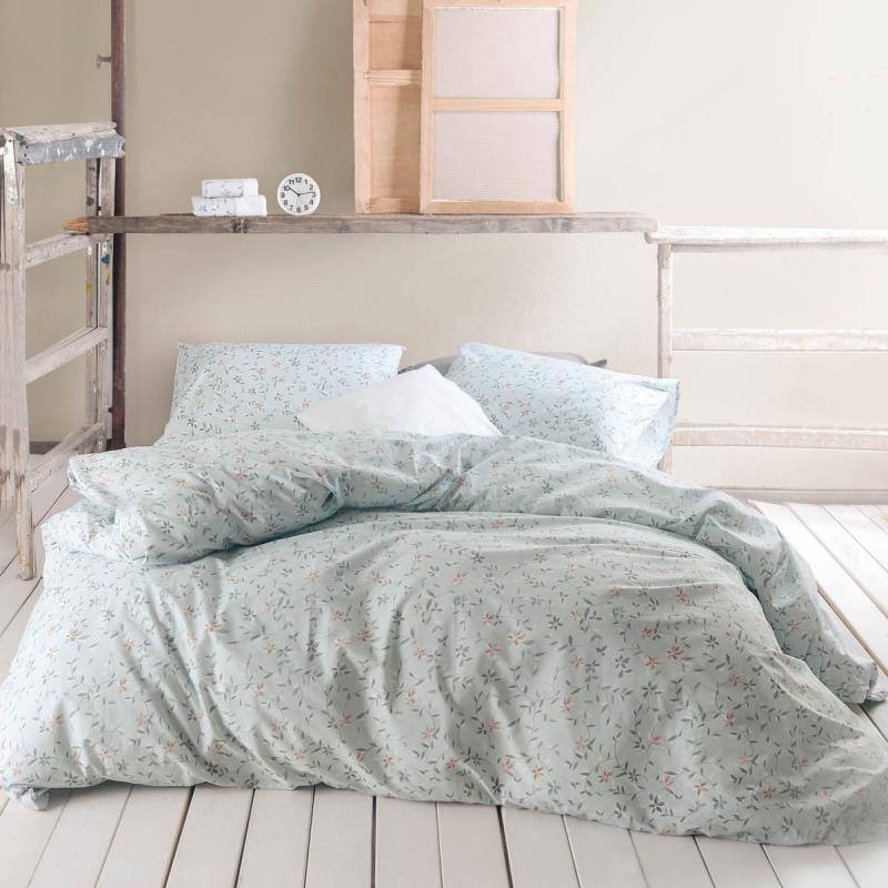 Υπέρδιπλη παπλωματοθήκη με φερμουάρ σε γαλάζιο χρώμα και φλοράλ σχέδιο από την εταιρεία Rythmos. Το ύφασμα είναι 100% βαμβάκι 144 κλωστών που το καθιστά απαλό και ανθεκτικό. Στο σετ περιλαμβάνονται οι μαξιλαροθήκες φάκελος. Συνδυάστε το με τα υπόλοιπα είδη της ίδιας σειράς για ένα ολοκληρωμένο αποτέλεσμα.