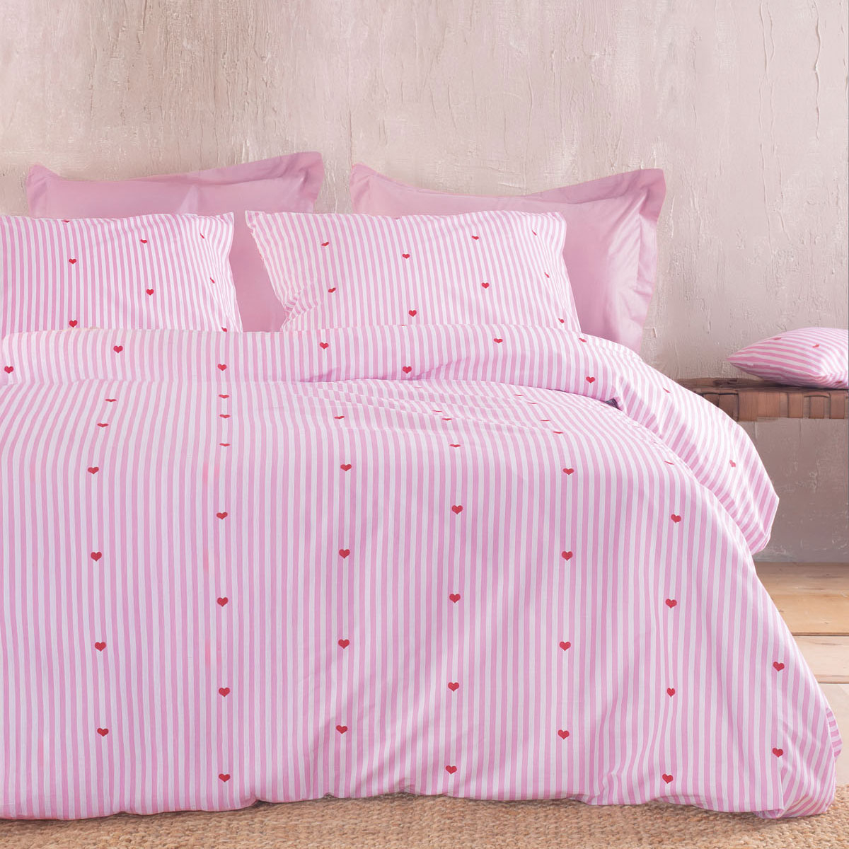Υπέρδιπλη παπλωματοθήκη με φερμουάρ σε ροζ χρώμα, με λευκές-κόκκινες λεπτομέρειες και ριγέ-καρδιές σχέδιο από την εταιρεία Rythmos. Είναι κατασκευασμένη από 100% βαμβάκι 144 κλωστών, που προσφέρει απαλότητα και ανθεκτικότητα. Στο σετ περιλαμβάνονται οι μαξιλαροθήκες φάκελος με το σχέδιο του πανωσέντονου. Συνδυάστε τα με τα υπόλοιπα προϊόντα του ίδιου σχεδίου για ένα ολοκληρωμένο αποτέλεσμα.