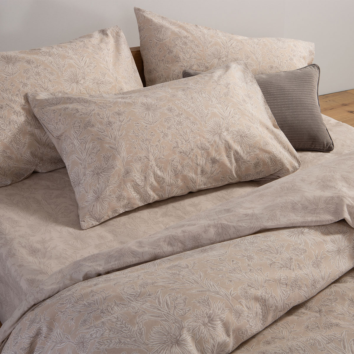 Παπλωματοθήκη υπέρδιπλη σετ της εταιρείας Nef-Nef με φλοράλ σχέδιο σε μπεζ αποχρώσεις. Είναι κατασκευασμένη από 100% βαμβάκι 144 κλωστών, που προσφέρει απαλότητα και ανθεκτικότητα. Η παπλωματοθήκη και η μαξιλαροθήκη είναι διπλής όψης αφού από την μια πλευρά έχουν το σχέδιο του πανωσέντονου ενώ η άλλη το σχέδιο του κατωσέντονου. Κλείνει με φερμουάρ στο κάτω μέρος. Η εταιρεία Nef-Nef διαθέτει πιστοποίηση Oeko-Tex, που εγγυάται ότι τα προϊόντα της είναι απαλλαγμένα από επιβλαβείς χημικές ουσίες.