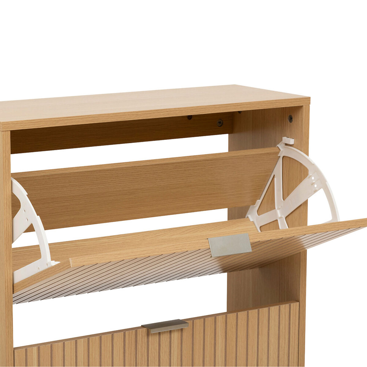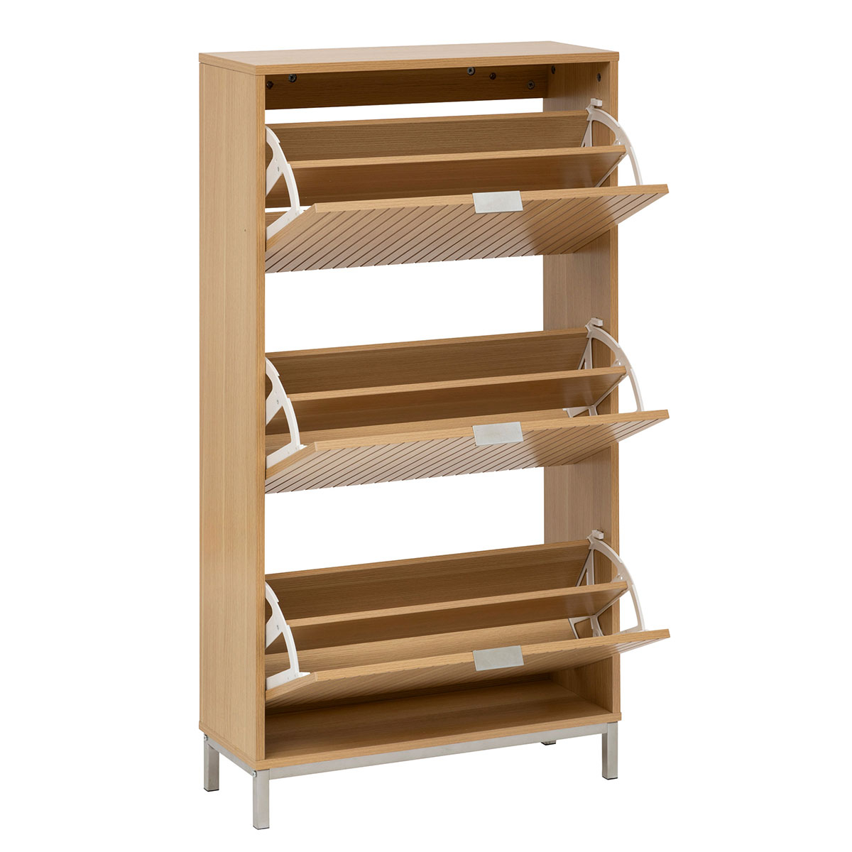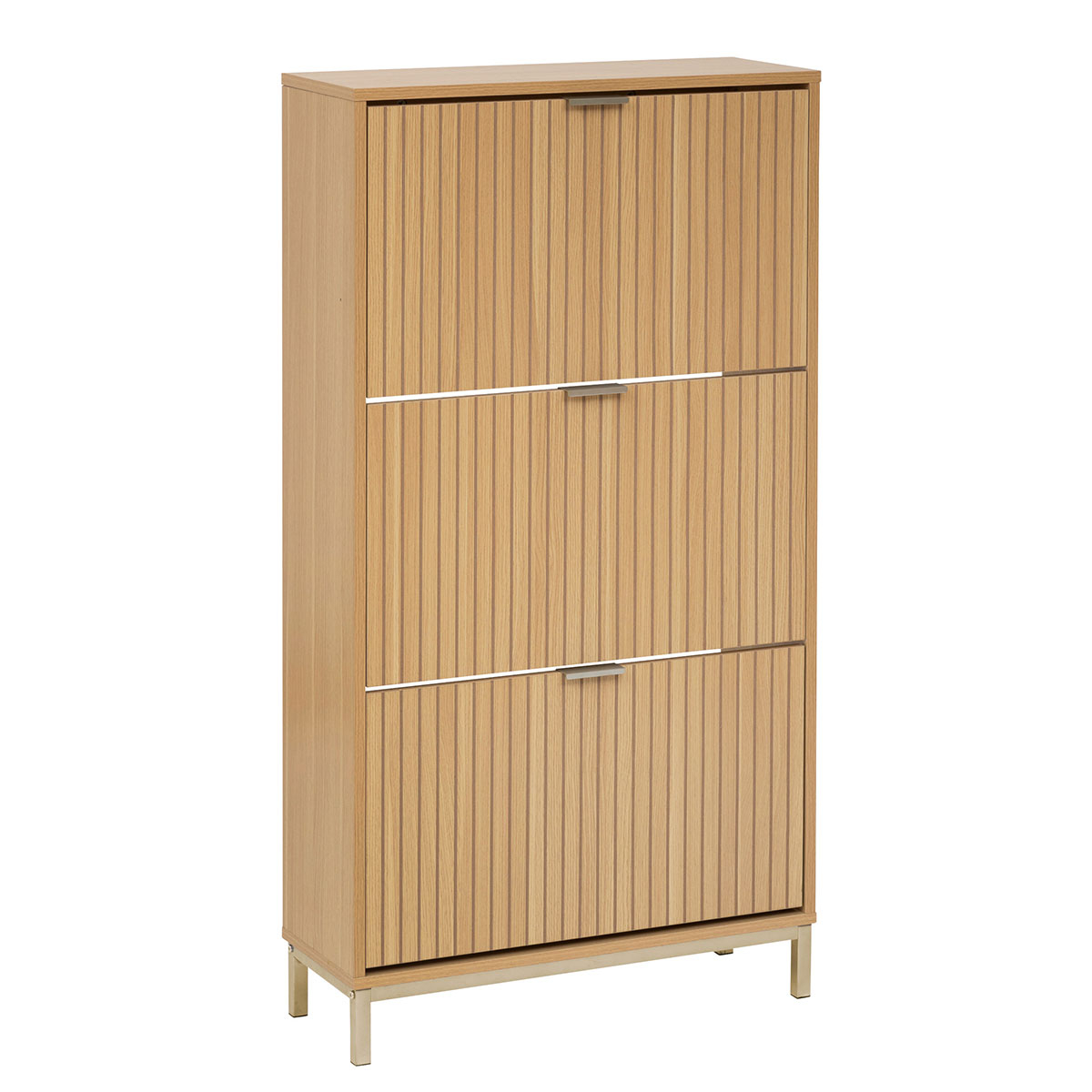 Παπουτσοθήκη με μίνιμαλ ύφος κατασκευασμένη από AGGLOMERE_E1 σε μπεζ χρώμα με μεταλλικό σκελετό. Διαθέτει 3 ράφια ανακλινόμενα που το κάθε ένα έχει 2 ρυθμιζόμενα επίπεδα για τοποθέτηση παπουτσιών ανάλογα με το μέγεθος τους. Έχει χώρο για έως 18 ζευγάρια παπούτσια και λεπτό σχεδιασμό για εξοικονόμηση χώρου. Μπορεί να τοποθετηθεί ακόμα και πίσω από πόρτα. Συνδυάστε το με τα υπόλοιπα είδη της ίδιας συλλογής για ένα ολοκληρωμένο αποτέλεσμα στο χώρο σας. *Το προϊόν έρχεται αμοντάριστο.*