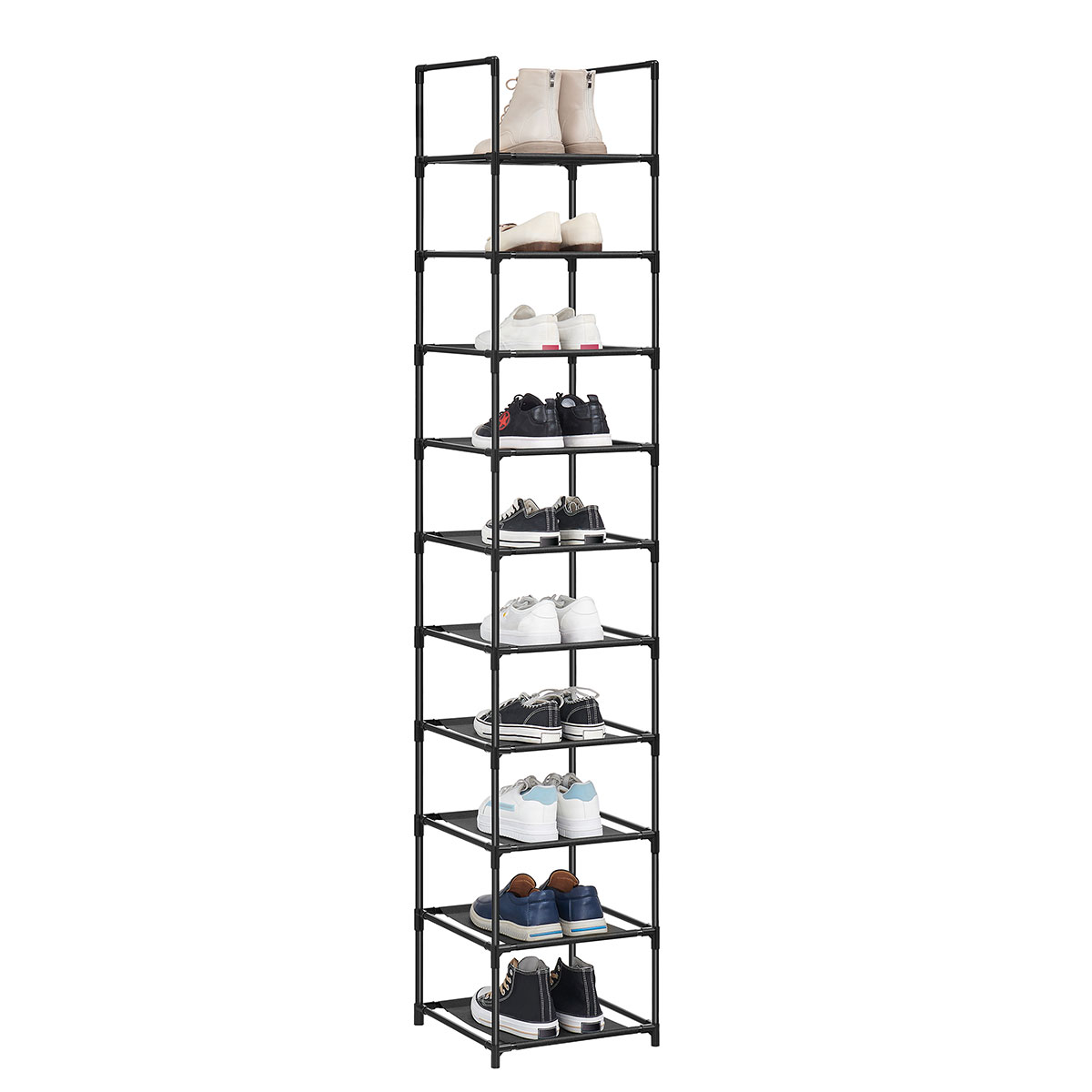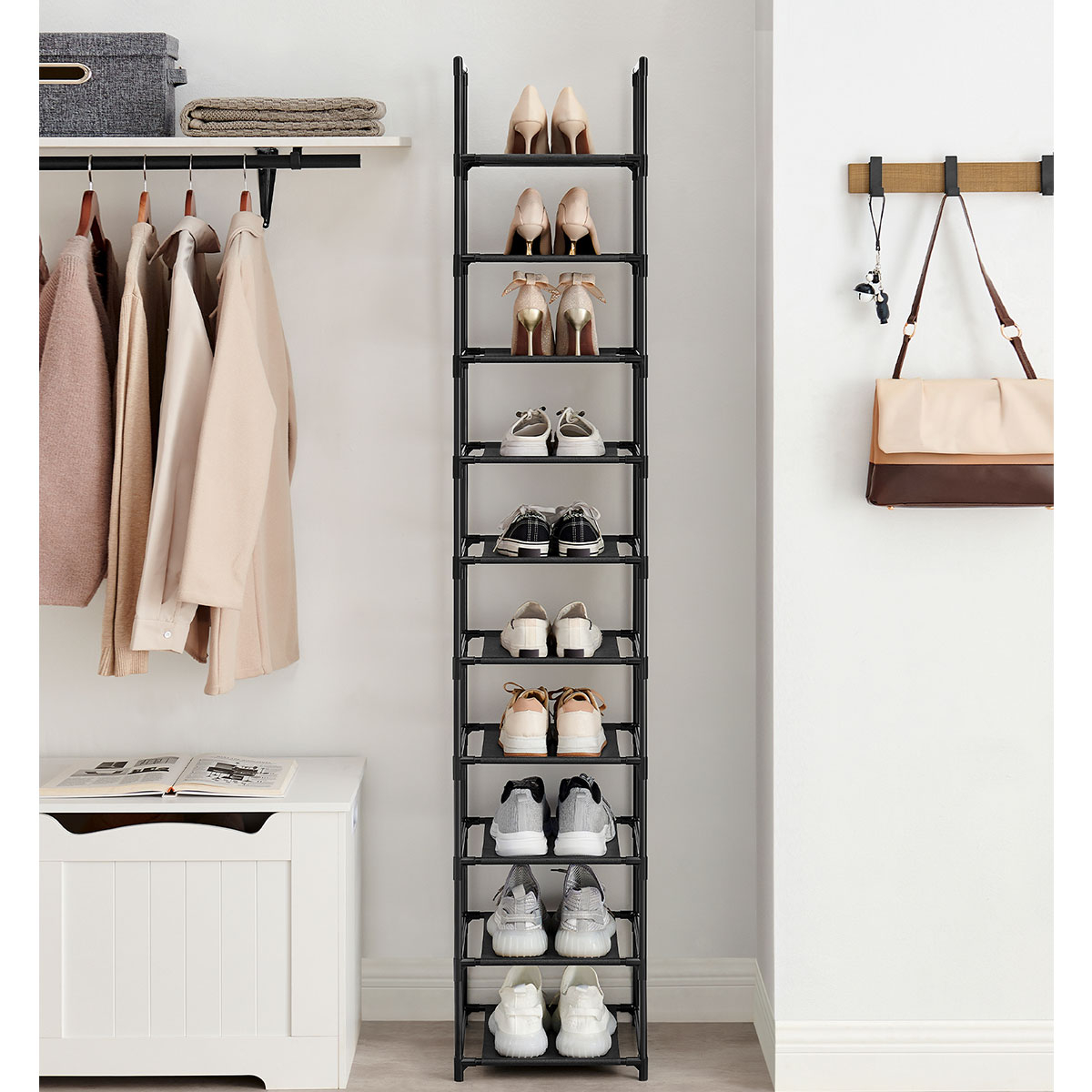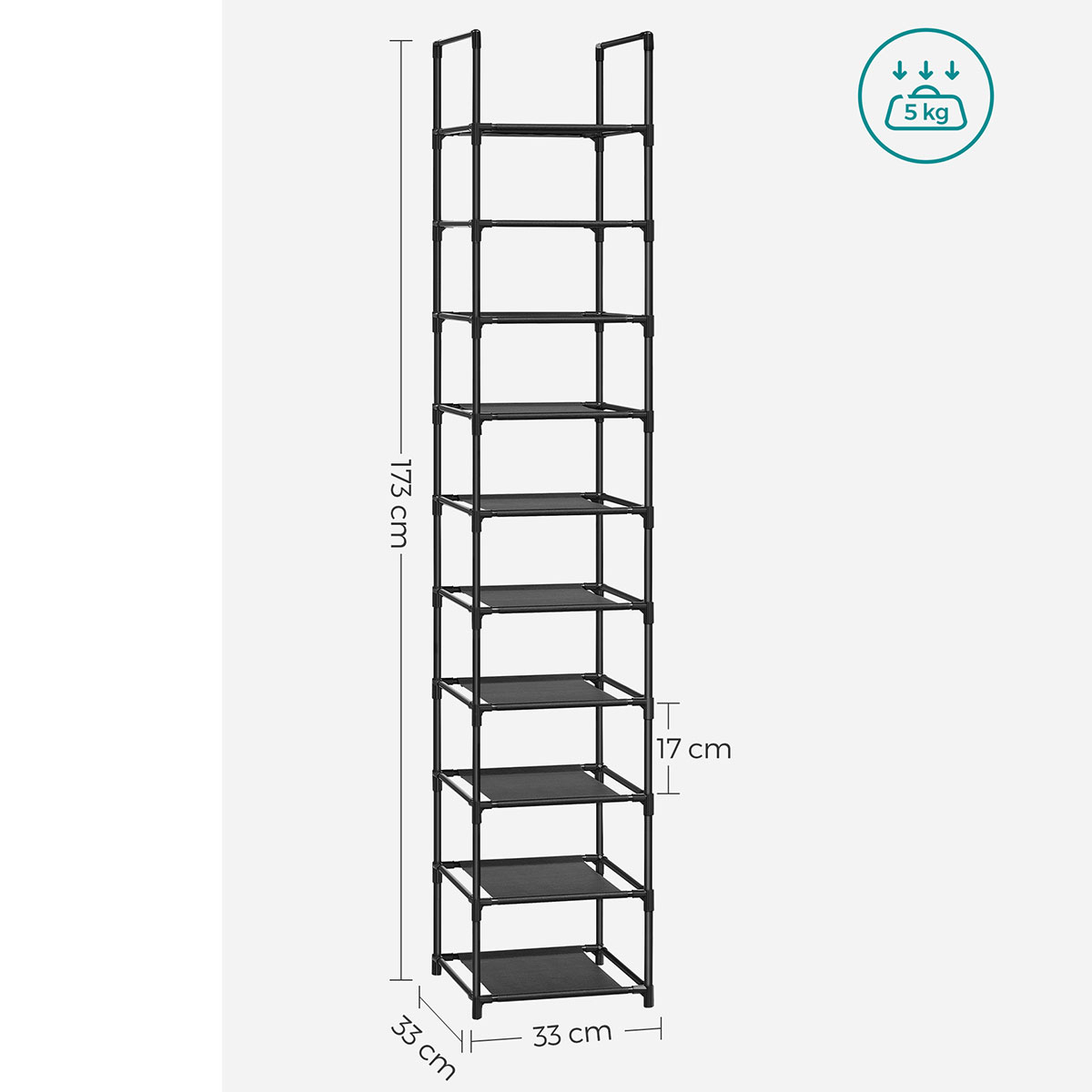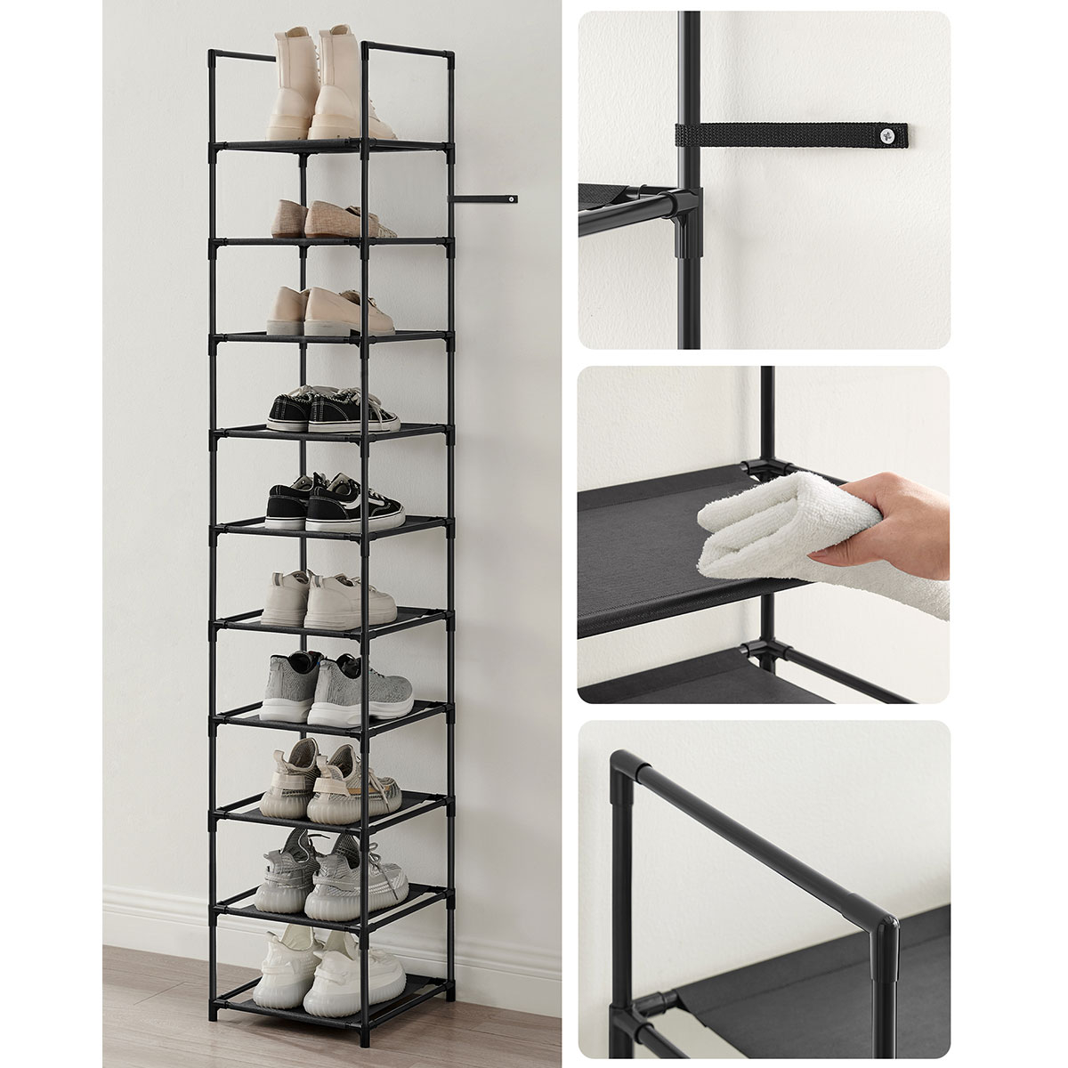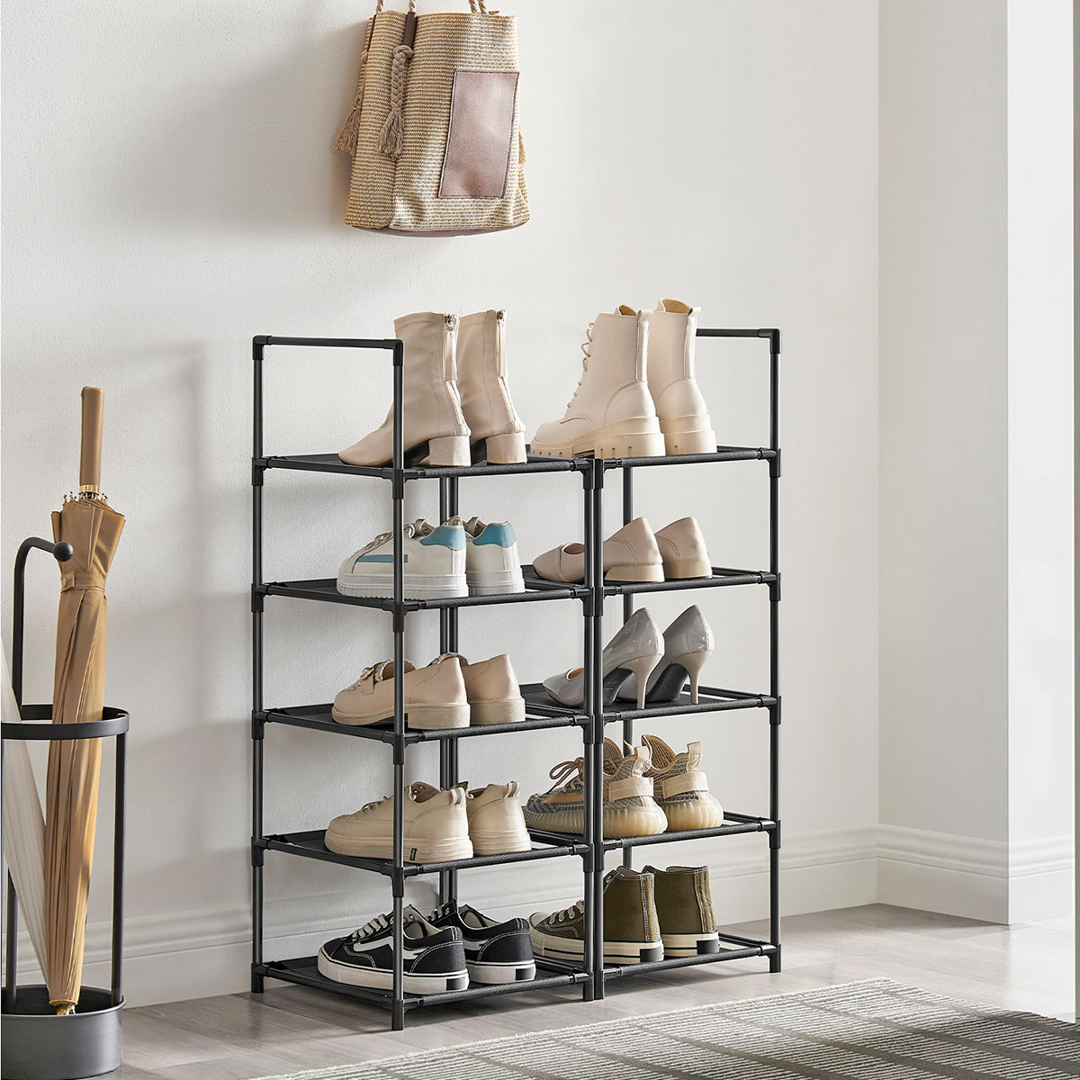 Στοιβαζόμενη παπουτσοθήκη 10 θέσεων σε μαύρο χρώμα από την εταιρεία Songmics. Χάρη στον σχεδιασμό της μπορείτε να της δώσετε το σχήμα που θέλετε για να χωράει στον χώρο σας. Το προϊόν έρχεται αμοντάριστο και συναρμολογείται βάσει οδηγιών.