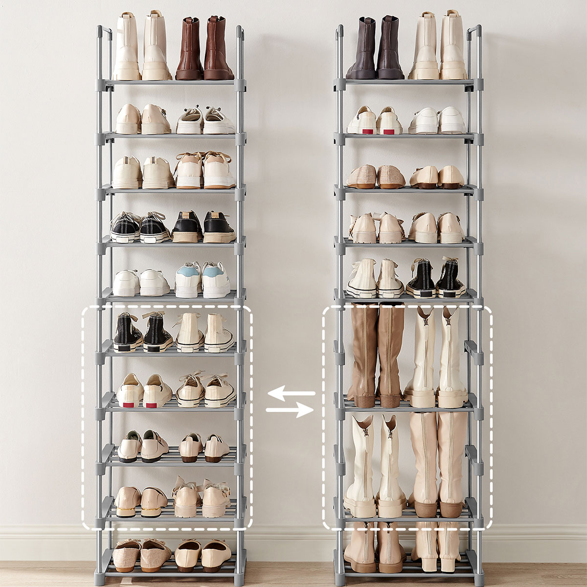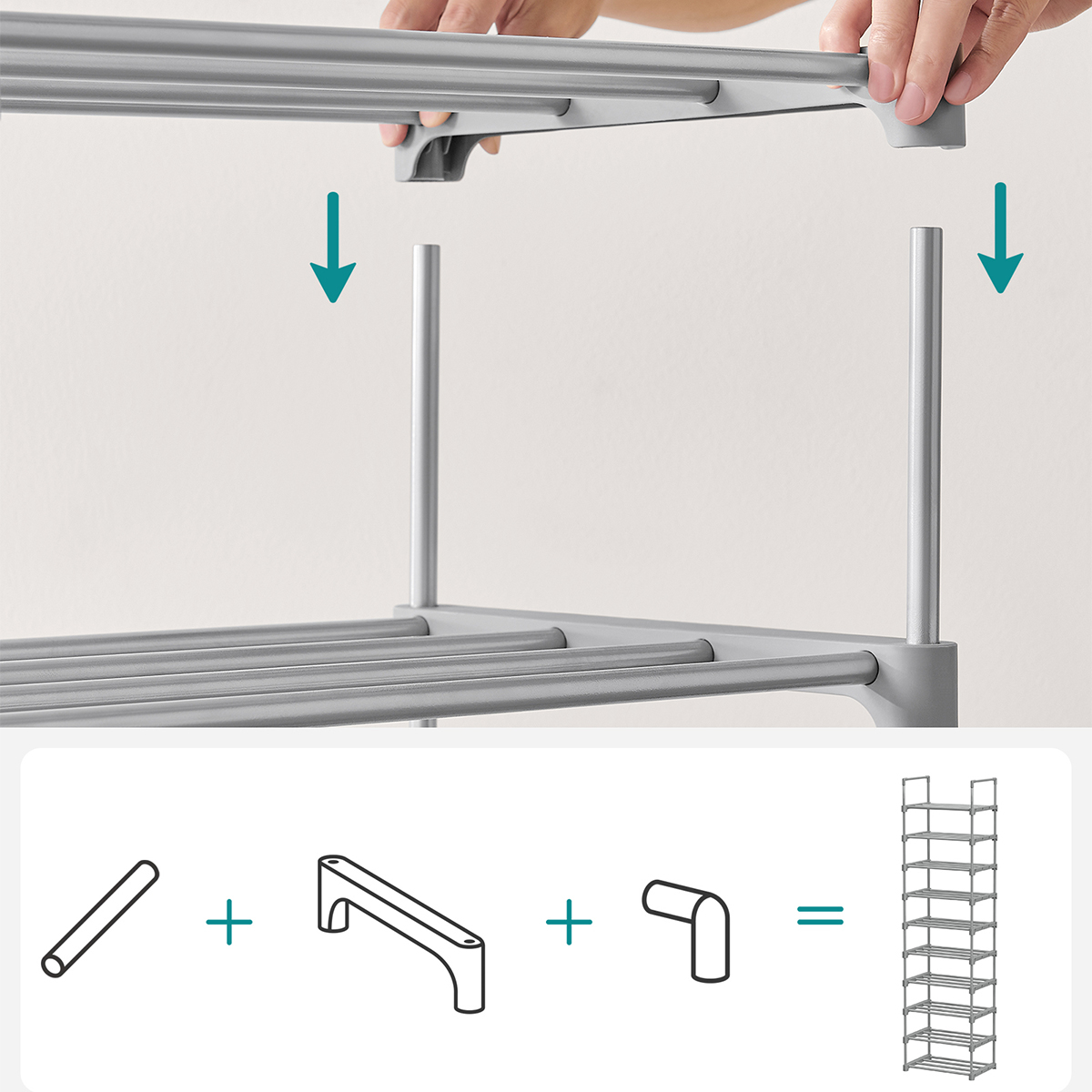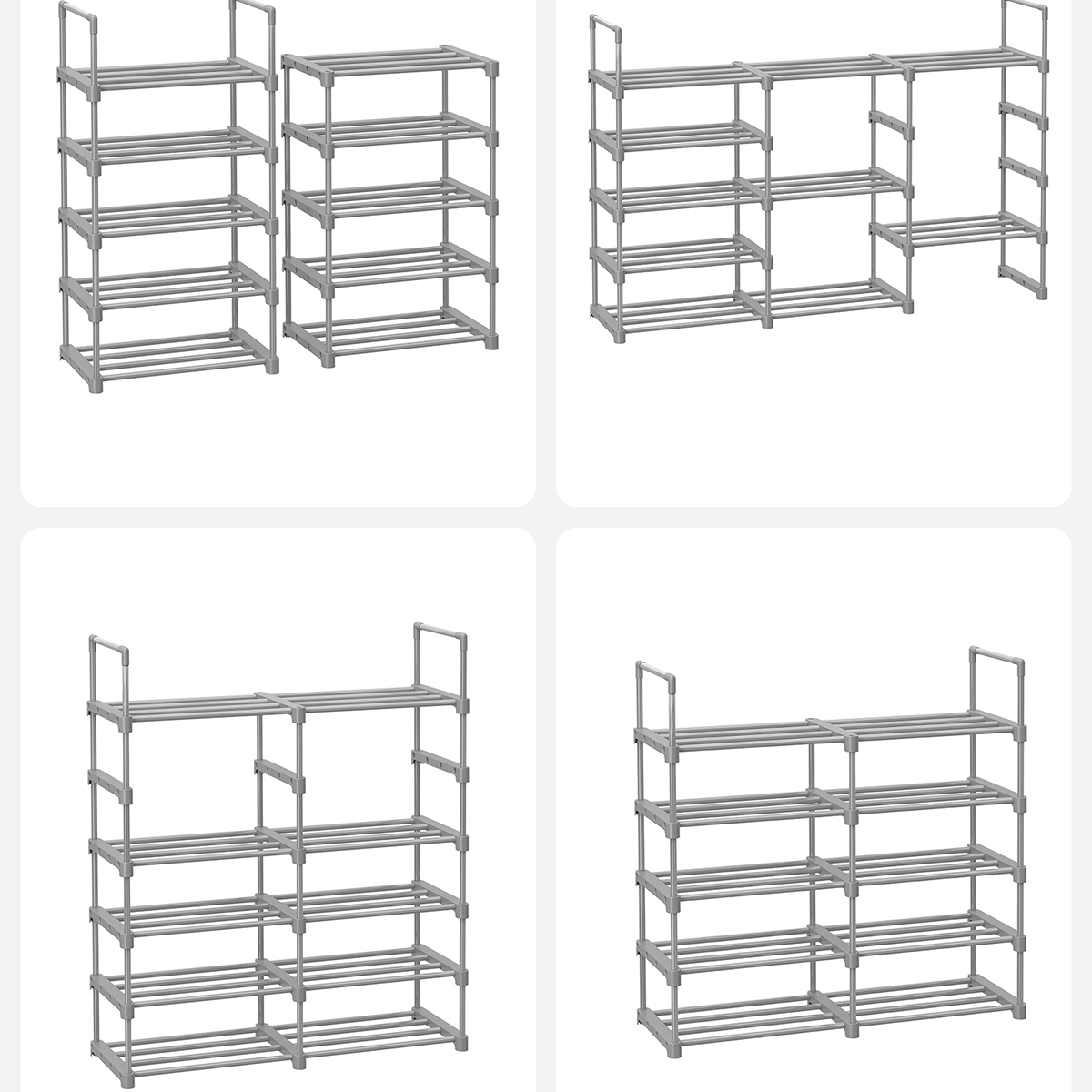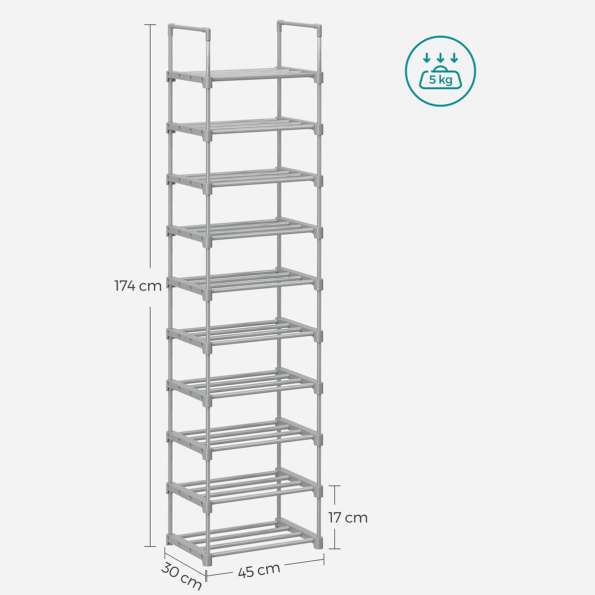Παπουτσοθήκη 20 θέσεων από την εταιρεία Songmics. Είναι κατασκευασμένη από μεταλλικό υλικό με πλαστικά μέρη σε γκρι χρώμα. Αποτελείται από 10 ράφια που το καθένα δέχεται έως και 2 ζευγάρια παπούτσια ή μπότες. Μπορείτε να το συναρμολογήσετε με 2 τρόπους, ανάλογα τις ανάγκες σας. Για να αποθηκεύσετε ψηλά παπούτσια ή μπότες μπορείτε να αφαιρέσετε κάποια ράφια. Ιδανικό έπιπλο για να έχετε πάντα τακτοποιημένα τα παπούτσια σας. Μέγιστο βάρος αντοχής ανά ράφι: 5kg. *Το προϊόν έρχεται αμοντάριστο και συναρμολογείται βάσει οδηγιών.*