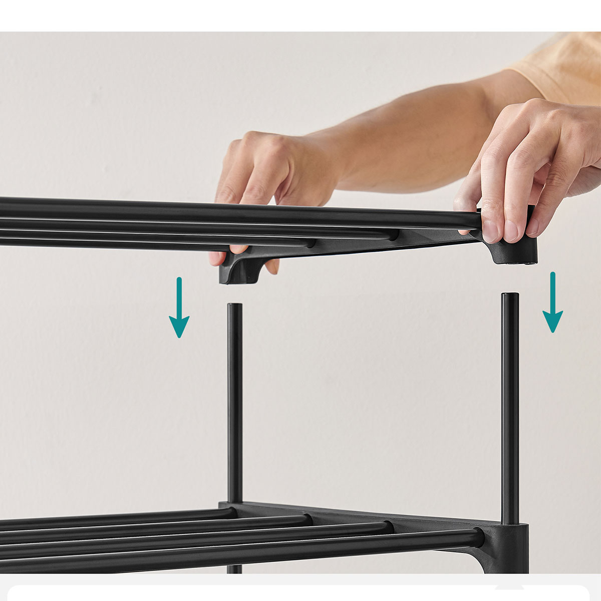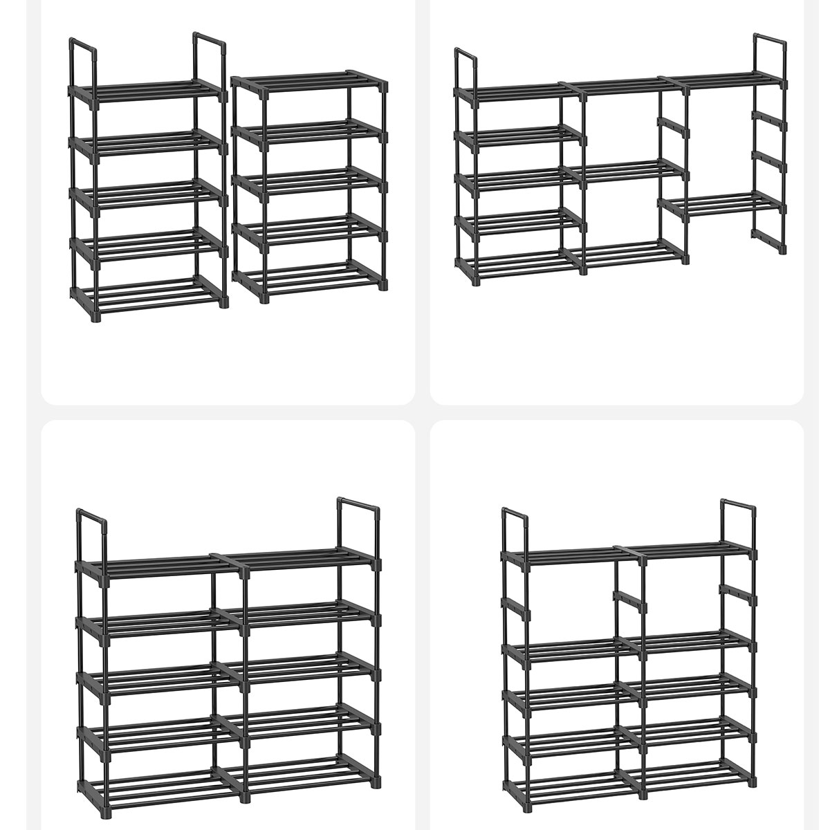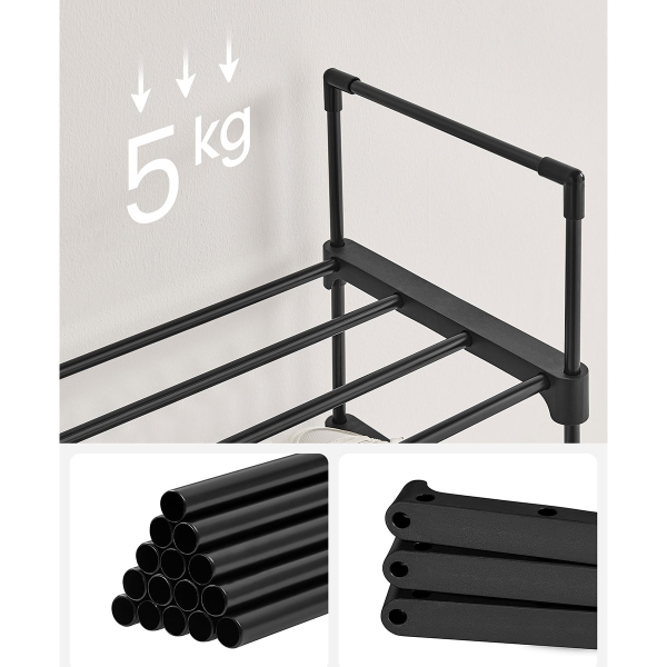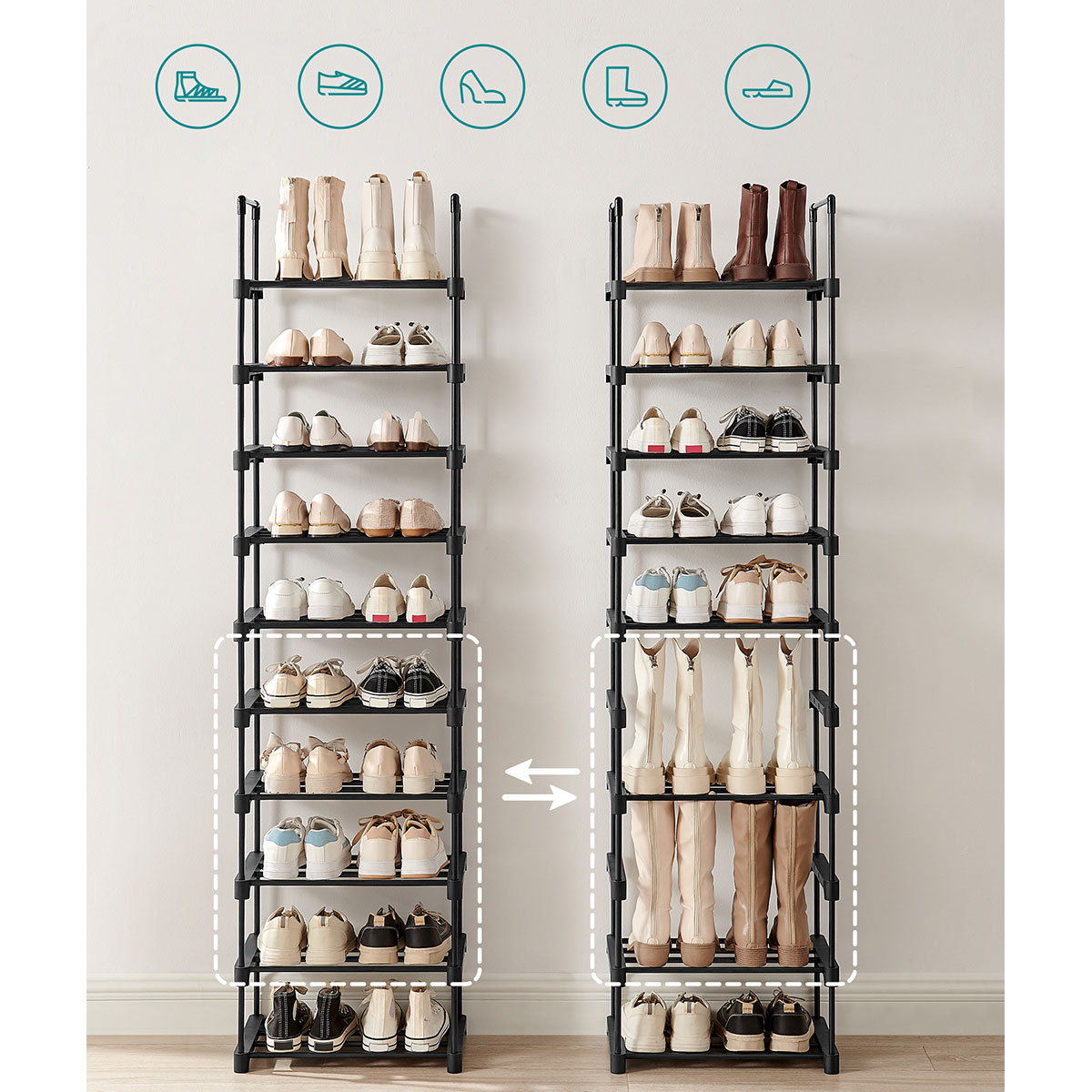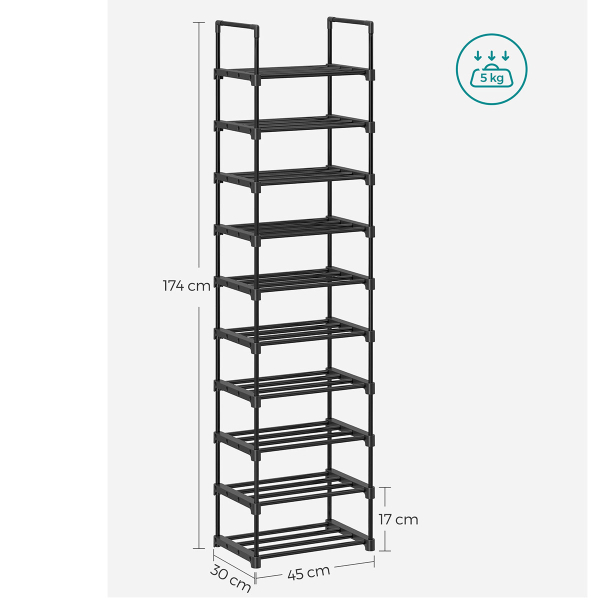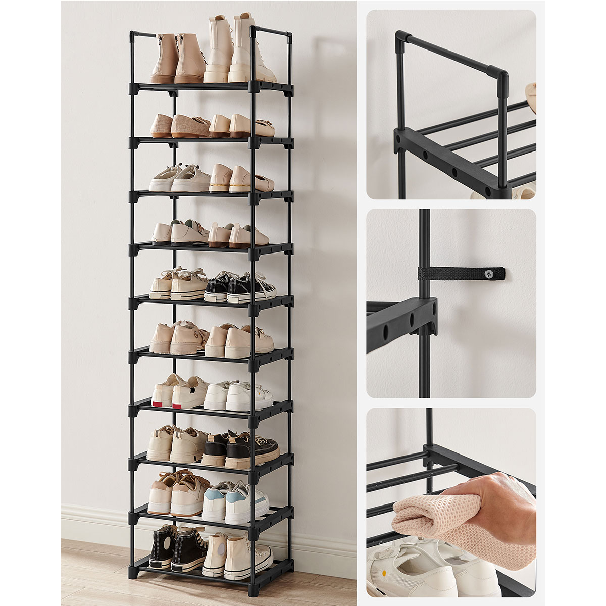 Παπουτσοθήκη 20 θέσεων από την εταιρεία Songmics. Είναι κατασκευασμένη από μεταλλικό υλικό σε μαύρο χρώμα με μαύρες πλαστικές λεπτομέρειες. Αποτελείται από 10 ράφια που το καθένα δέχεται έως και 2 ζευγάρια παπούτσια. Είναι αποσπώμενη που σημαίνει ότι μπορεί να χωριστεί εύκολα σε 2 παπουτσοθήκες ή και περισσότερες. Τα ράφια της είναι ρυθμιζόμενα μπορείτε δηλαδή να αφήσετε κενό ένα ράφι για πιο ογκώδη παπούτσια. Διαθέτει εξαρτήματα στερέωσης τοίχου για μεγαλύτερη σταθερότητα. Μέγιστο βάρος αντοχής ανά ράφι 5kg. *Το προϊόν έρχεται αμοντάριστο και συναρμολογείται βάσει οδηγιών.*