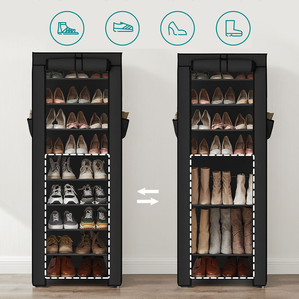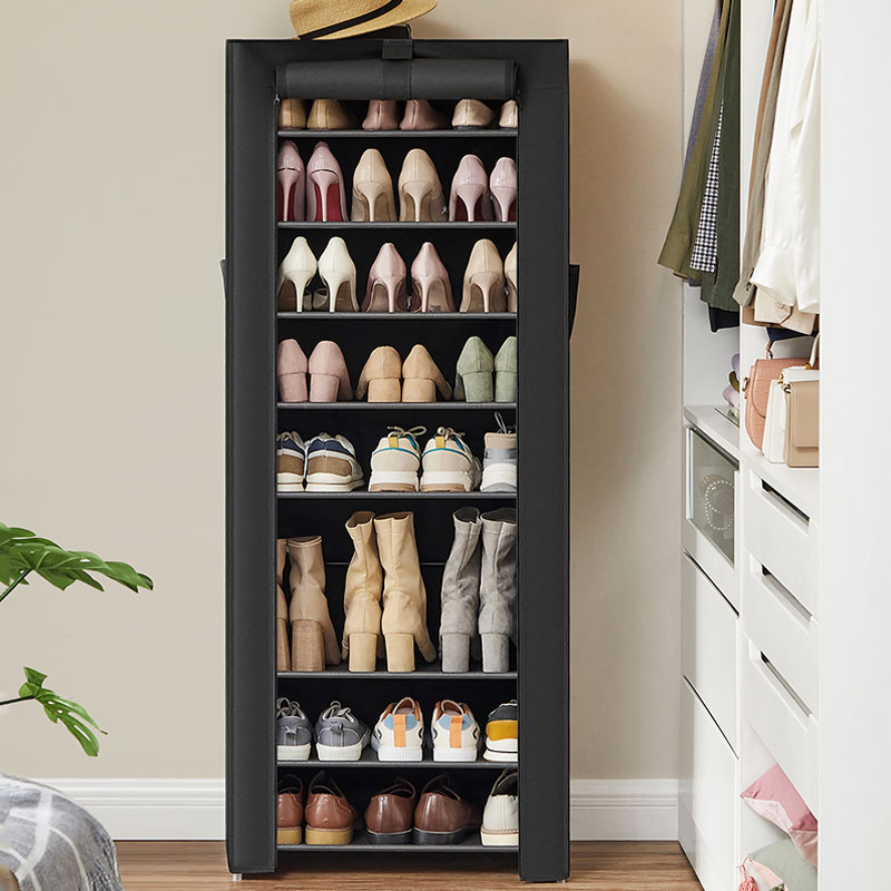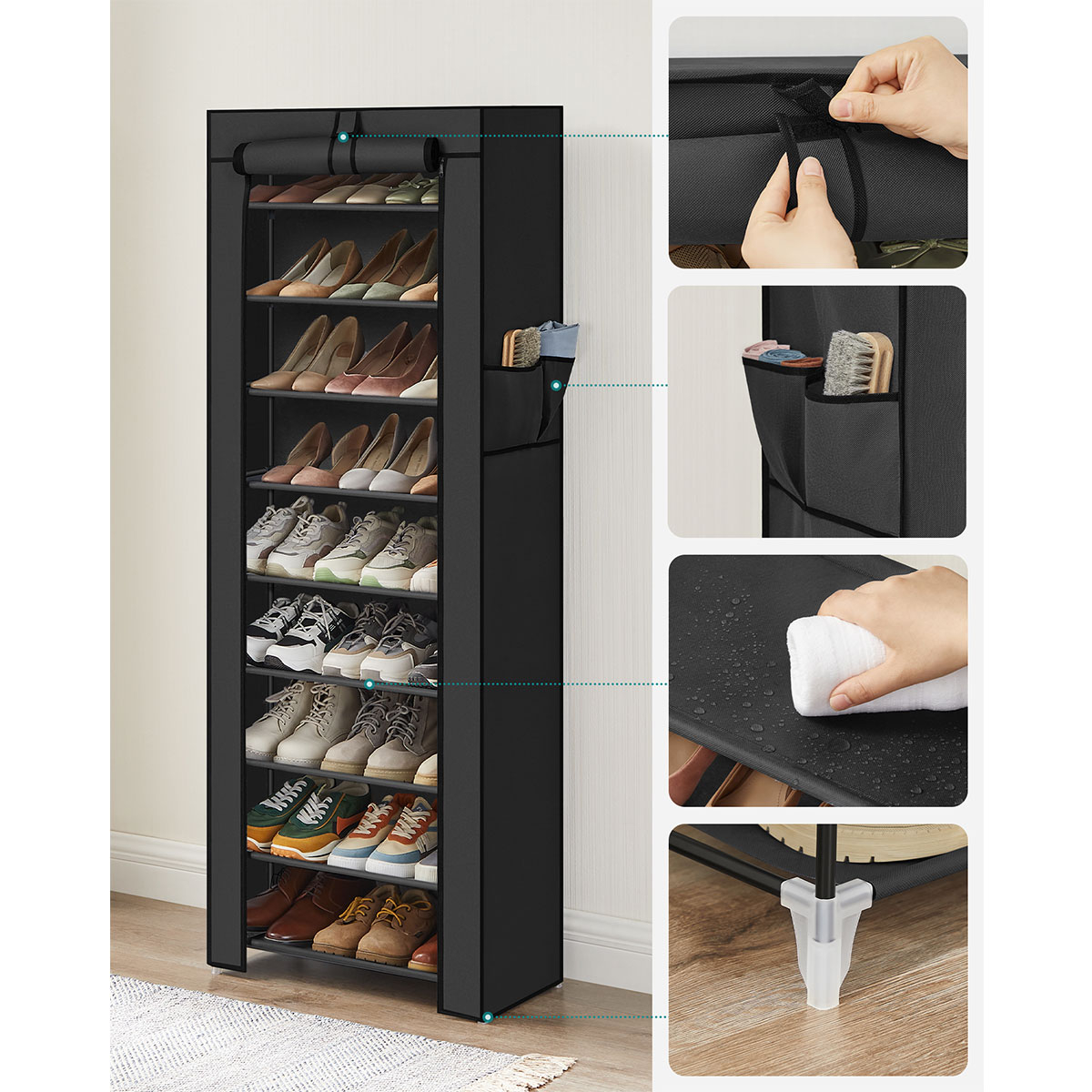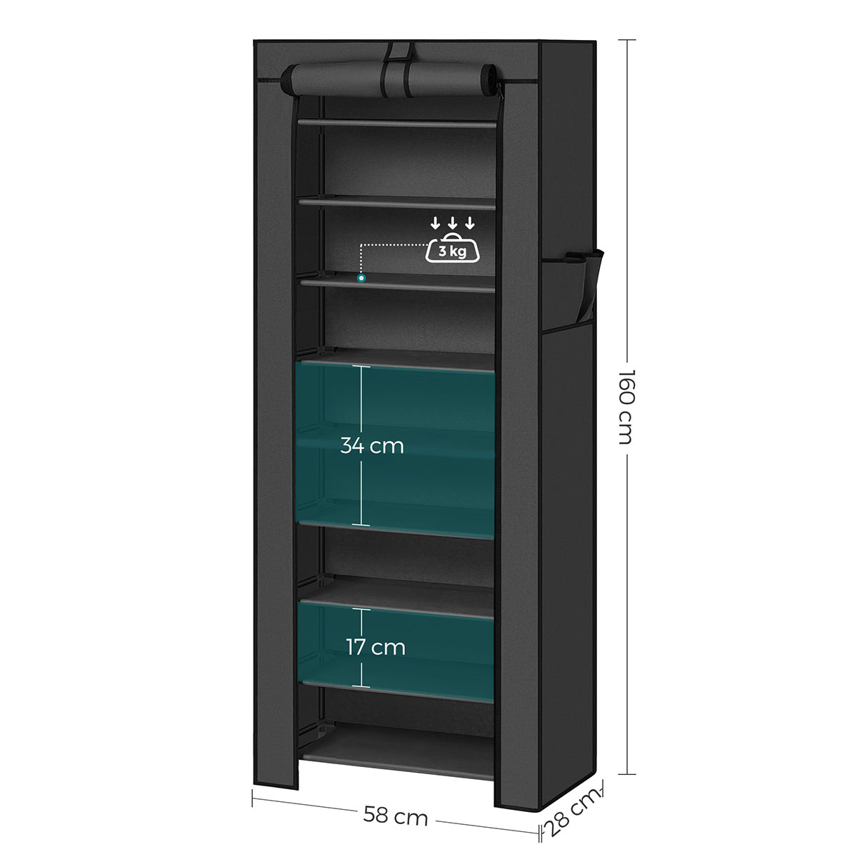 Παπουτσοθήκη σε ανθρακί χρώμα από την εταιρεία Songmics. Διαθέτει υφασμάτινο κάλυμμα για να προστατεύει τα παπούτσια από την σκόνη. Από δεξιά κ αριστερά έχει θήκες για να αποθηκεύετε μικροπράγματα. Τα ράφια της είναι ρυθμιζόμενα μπορείτε δηλαδή να αφήσετε κενό ένα ράφι για πιο ογκώδη παπούτσια. Το προϊόν έρχεται αμοντάριστο και συναρμολογείται βάσει οδηγιών.