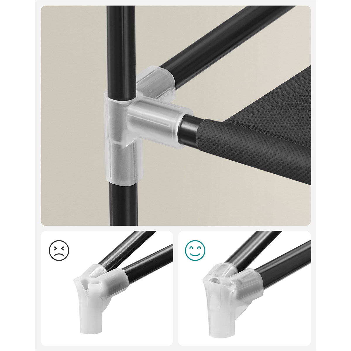 Παπουτσοθήκη 36 θέσεων από την εταιρεία Songmics. Έχει μεταλλικό σκελετό σε μαύρο χρώμα με πλαστικές λεπτομέρειες και μαύρο ύφασμα nonwoven. Αποτελείται από 9 ράφια που το καθένα δέχεται έως και 3 ζευγάρια παπούτσια. Διαθέτει μαύρο υφασμάτινο κάλυμμα για να προστατεύει τα παπούτσια από τη σκόνη. Από δεξιά κ αριστερά έχει θηκάκια για να αποθηκεύετε μικροπράγματα. Τα ράφια της είναι ρυθμιζόμενα μπορείτε δηλαδή να αφήσετε κενό ένα ράφι για πιο ογκώδη παπούτσια. Διαθέτει εξαρτήματα στερέωσης τοίχου για μεγαλύτερη σταθερότητα. Μέγιστο βάρος αντοχής ανά ράφι 3kg. *Το προϊόν έρχεται αμοντάριστο και συναρμολογείται βάσει οδηγιών.*