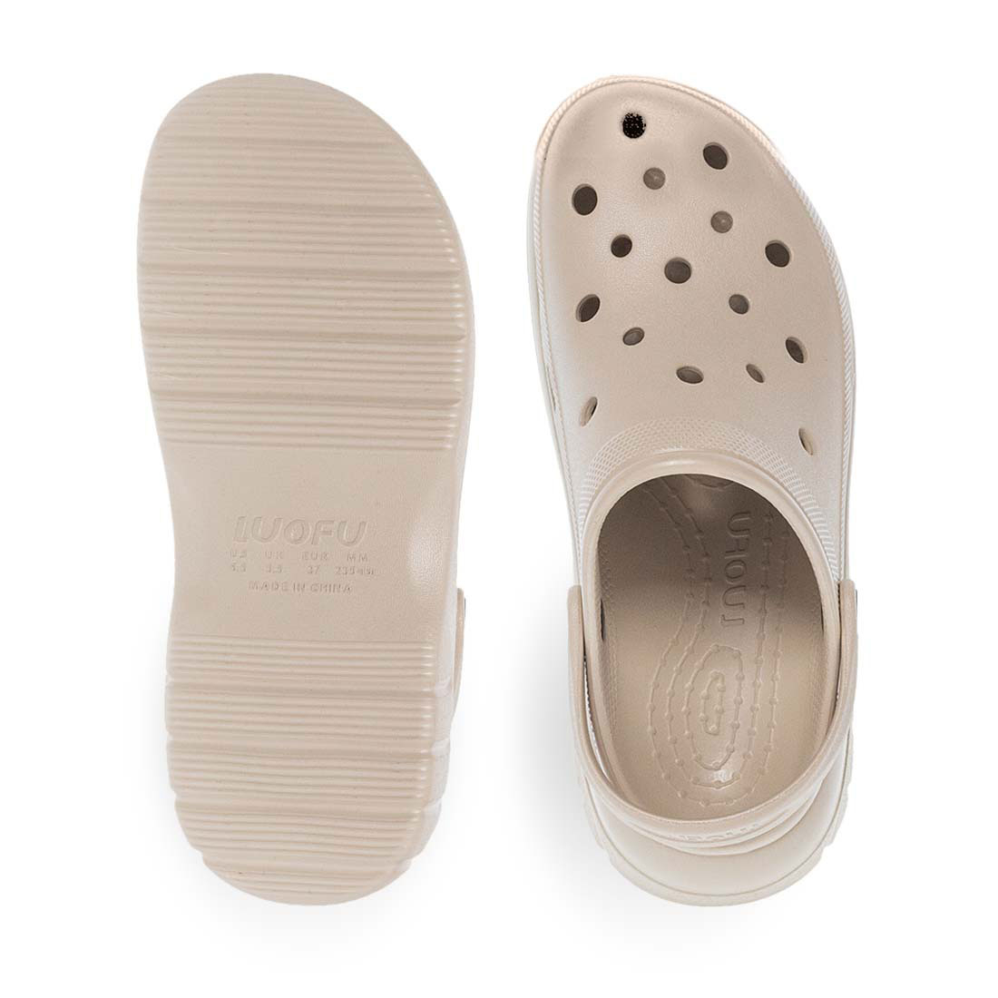 Γυναικεία αδιάβροχα πέδιλα παραλίας clogs με πλατφόρμα από την εταιρεία Luofu By Parex σε μπεζ χρώμα. Πρόκειται για σαμπό με λουρί στο πίσω μέρος που προσφέρει σταθερή εφαρμογή. Το λουρί μπορεί να μετακινηθεί και να τοποθετηθεί στο πάνω μέρος του πέδιλου. Είναι κατασκευασμένα από συνθετικό υλικό EVA άριστης ποιότητας, που εξασφαλίζει ελαστικότητα, ευλυγισία και αντοχή. Έχουν τρύπες στο πλάι για αερισμό του ποδιού και την αποστράγγιση του νερού. Ο εσωτερικός πάτος είναι αρκετά μαλακός για περισσότερη άνεση. Η σόλα τους είναι αντιολισθητική για μεγαλύτερη σταθερότητα. Είναι ιδανικά τόσο για το σπίτι και τη βόλτα, όσο και για ατελείωτες στιγμές στην άμμο και την παραλία.