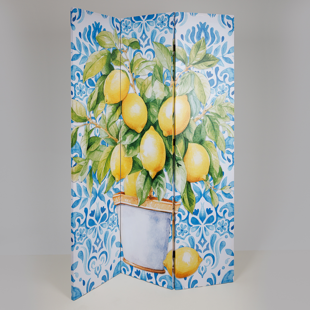 Διαχωριστικό παραβάν διπλής όψης από την εταιρεία Estheti με μπλε φόντο και λεμονιές στα σχέδια. Ο σκελετός είναι κατασκευασμένος από ξύλο και έχει επιφάνεια από υφασμάτινο καμβά. Το σχέδιο είναι τυπωμένο πάνω. Μπορείτε να ρυθμίσετε το μήκος του παραβάν διπλώνοντάς το περισσότερο ή λιγότερο. Ιδανικό για να διαχωρίσετε ή να διακοσμήσετε τον χώρο σας. Κατάλληλο για να χαρίσετε μια μοντέρνα πινελιά στον χώρο σας.